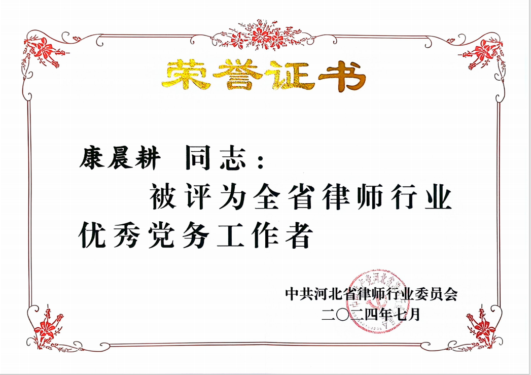 這份榮譽是對康晨耕律師多年來牢記使命、忠誠奉獻的高度認可。未來,他將繼續發揮黨員的先鋒模范作用,以更加昂揚的精神狀態、更加扎實的工作作風、更加有力的工作舉措,不斷開創黨務工作新局面,做黨和人民滿意的好律師。國浩石家莊也將以此為契機,繼續堅持以黨建帶所建,以所建促黨建,努力在推進河北省律師行業高質量發展中再創佳績、再立新功!