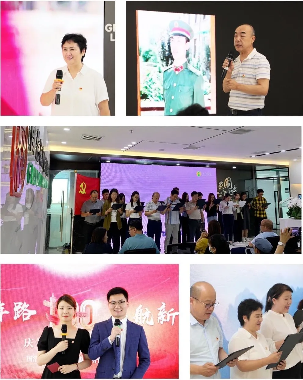 匯演開始前,全體參會人員觀看了重溫黨史100年紀錄片《光輝黨史 百年誕辰》。從1921到2021,從南湖的紅船到天安門上“中國人民站起來了”的高呼,再到全面建成小康社會,中國共產黨在憂患中誕生、成長、壯大的艱辛歷程看得大家內心火熱。隨后,在謝孟暉副書記的帶領下,全體黨員在莊嚴的黨旗下,重溫入黨誓詞,重憶入黨初心。