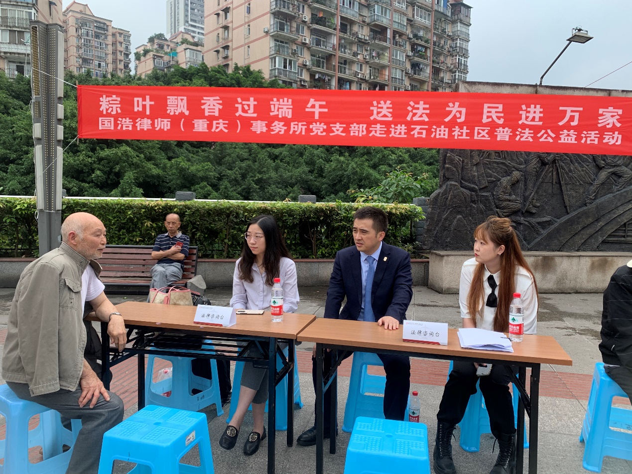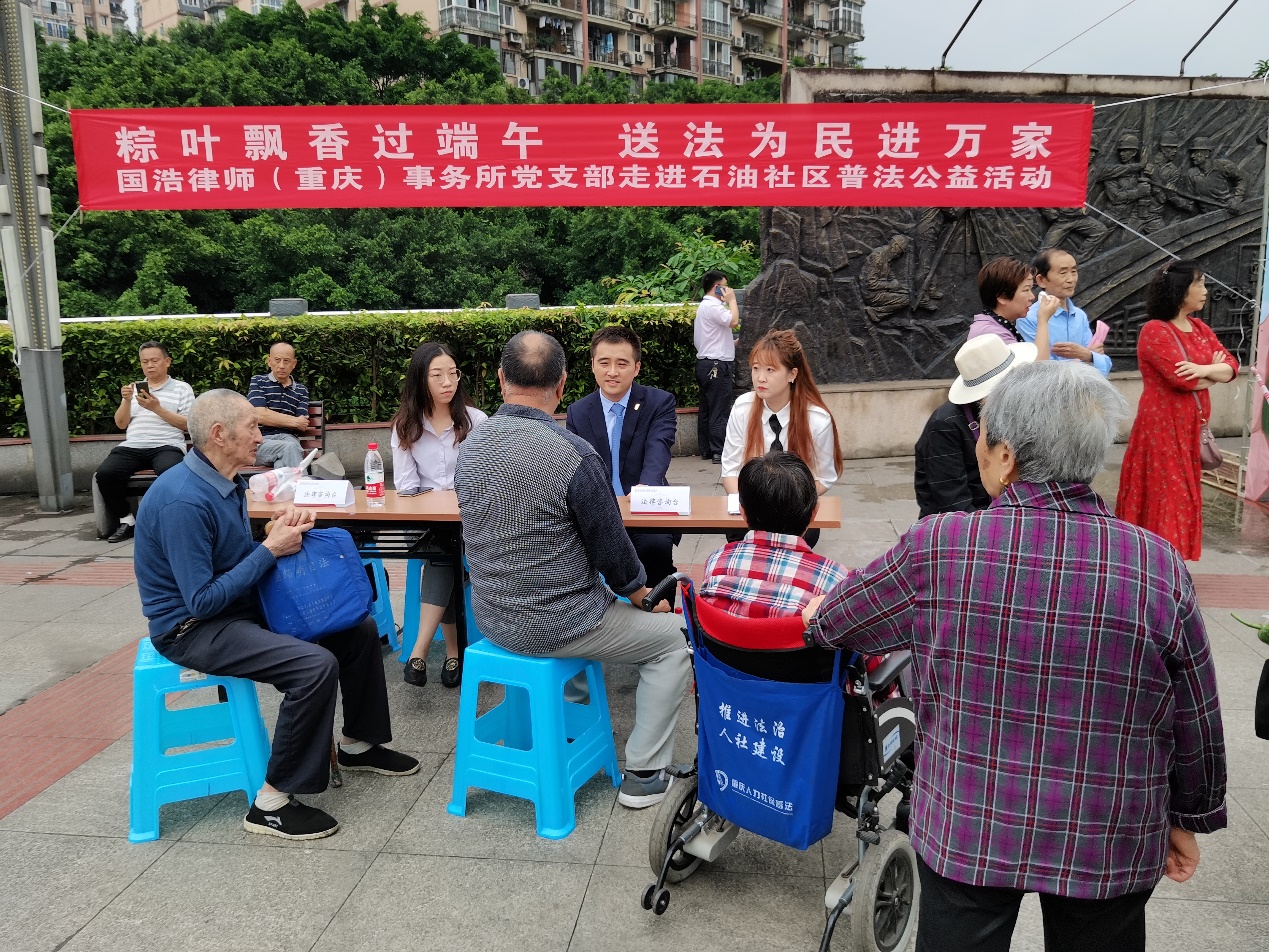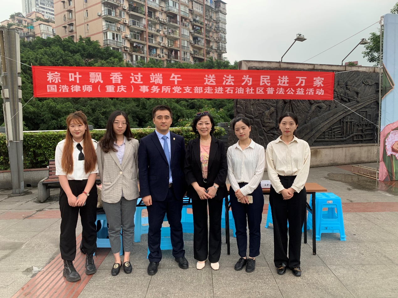 為持續(xù)開(kāi)展“我為群眾辦實(shí)事”實(shí)踐活動(dòng),2021年6月10日端午節(jié)前,在國(guó)浩重慶黨支部、國(guó)浩重慶管委會(huì)的組織下,國(guó)浩重慶黨員律師黃鵬、律師張?jiān)虑俸蛯?shí)習(xí)律師劉杰思、蘭一新等走進(jìn)重慶市江北區(qū)大石壩街道石油社區(qū),開(kāi)展了“粽葉飄香過(guò)端午,送法為民進(jìn)萬(wàn)家”公益普法宣傳活動(dòng),為社區(qū)居民送上“端午節(jié)法治大禮包”。