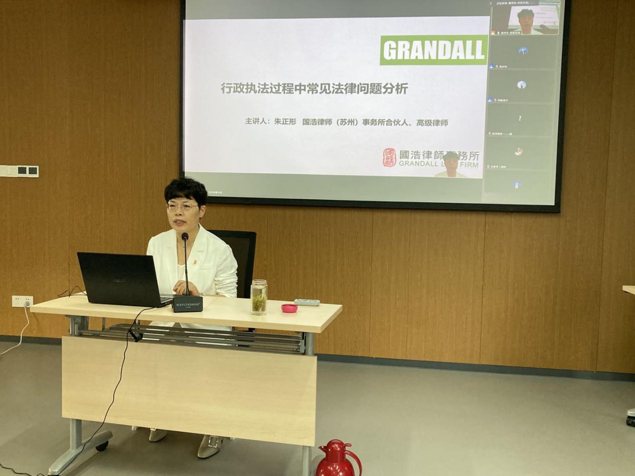 參觀結束后,國浩蘇州黨員律師還一起現場參加了由蘇州市律師協會主辦的《律師如何做好政府法律顧問》專題實務培訓。本次培訓采取線上與線下相結合的方式,國浩蘇州黨員合伙人朱正形作為第二個主講嘉賓作了《行政執法過程中常見法律問題分析》主題講座,圍繞律師參與法治政府建設,以法律顧問的身份協助政府處理好行政管理事務等方面為大家進行分享。她還在課后就如何擔任政府的法律顧問、如何為政府在法律授權范圍內行使職權提供法律支持等方面與現場和線上的同仁進行交流互動,獲得良好效果。