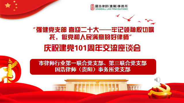 為慶祝建黨101周年,學(xué)習(xí)宣傳貫徹貴州省第十三次黨代會(huì)精神,2022年6月25日,貴陽(yáng)市律師行業(yè)第一聯(lián)合黨支部、第三聯(lián)合黨支部蒞臨國(guó)浩貴陽(yáng)辦公室開(kāi)展“強(qiáng)健黨支部 喜迎二十大——牢記領(lǐng)袖殷切囑托,做黨和人民滿意的好律師”主題慶祝中國(guó)共產(chǎn)黨成立101周年交流座談會(huì)。國(guó)浩貴陽(yáng)黨支部書(shū)記蘭鋼、副書(shū)記潘艷等熱情接待并參加了座談。