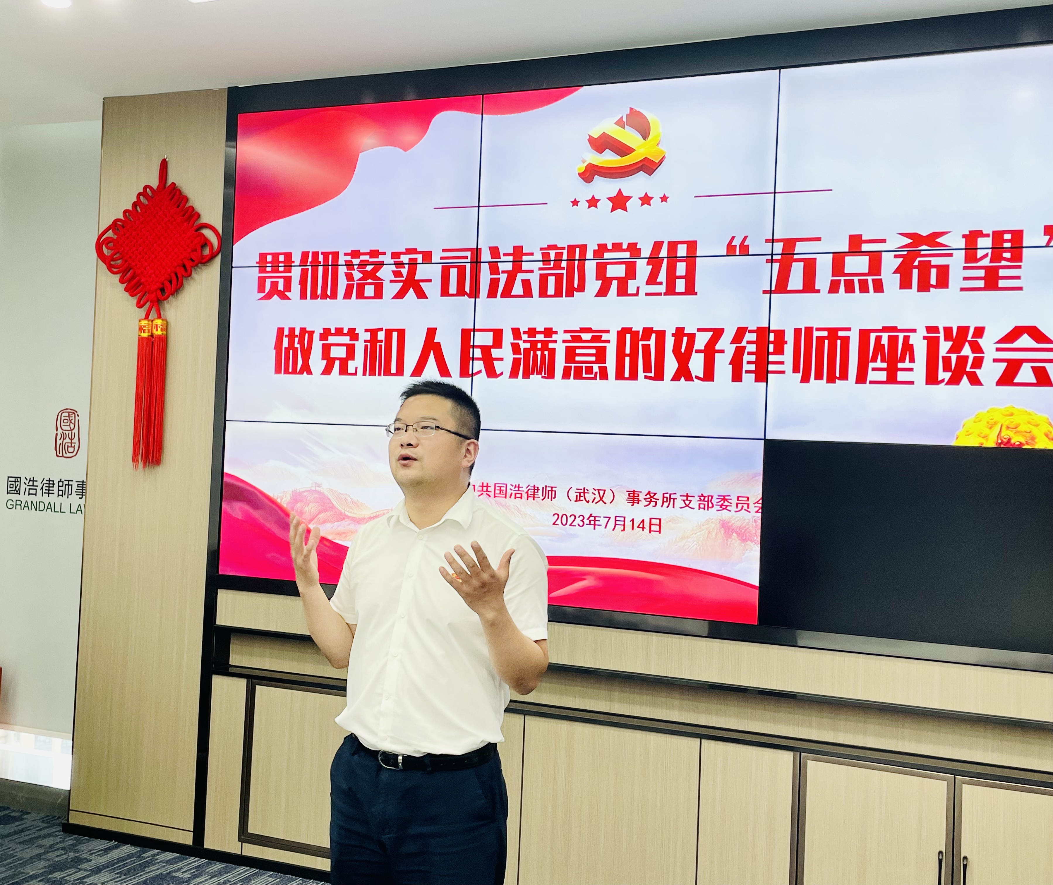 為深入學習貫徹習近平總書記關于“努力做黨和人民滿意的好律師”重要指示精神,響應和落實司法部黨組在律師工作座談會上對廣大律師提出的“五點希望”,積極響應全國律協倡議,2023年7月14日,國浩武漢黨支部組織召開學習司法部律師工作座談會精神會議。本次學習由國浩武漢黨支部副書記、律師胡斌主持。