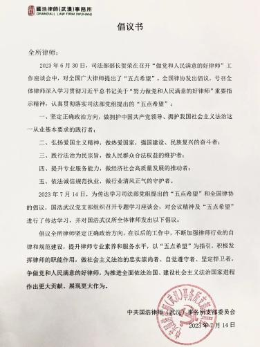 最后,國浩武漢黨支部根據“五點希望”結合律所實際情況發起《倡議書》,國浩武漢全體律師積極響應并署名表示堅決履行《倡議書》,誓以行動響應座談會精神,堅定正確政治方向,在以后的工作中,不斷加強律師行業的自律和規范建設,提升律師專業素養和服務水平,深耕專業領域,以“五點希望”為指引,積極發揮律師的職能作用,恪守職業道德和執業紀律,做社會主義法治的忠實崇尚者、自覺遵守者、堅定捍衛者,爭做黨和人民滿意的好律師,為推進全面依法治國、建設社會主義法治國家進程做出更大貢獻、展現更大作為。
