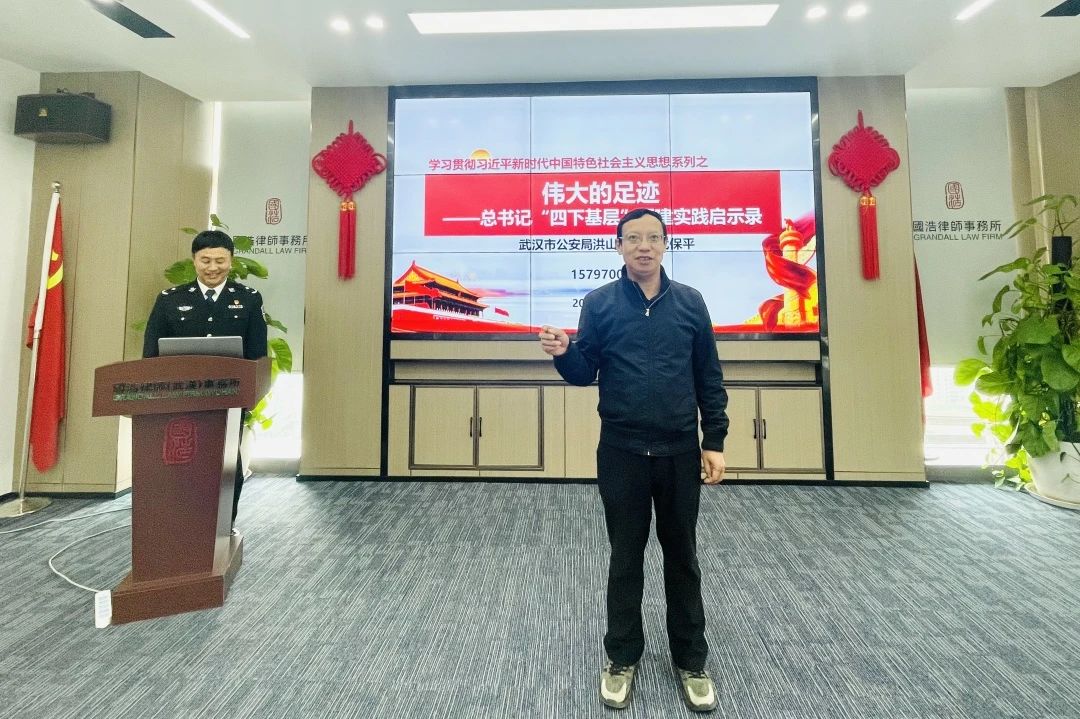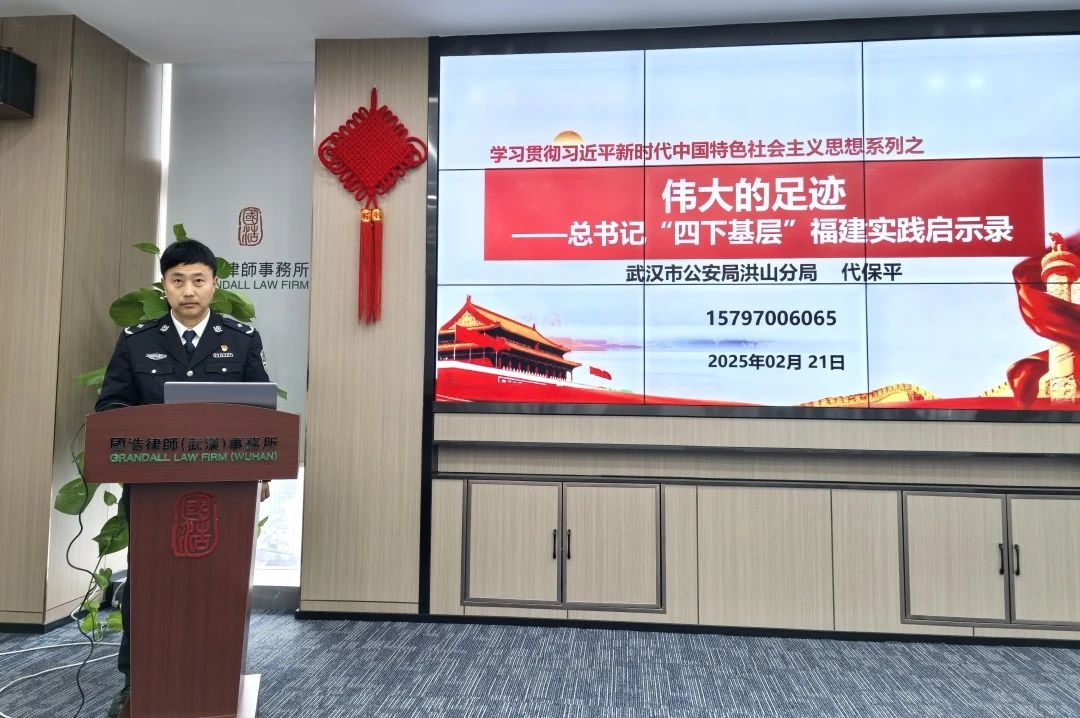 2月21日,國浩武漢黨支部開展“學思踐悟新思想,砥礪奮進新征程”專題紅色宣講活動,特邀武漢市公安局洪山區(qū)分局正處級民警、三級警監(jiān),公安作家,《青年的榜樣—— 一位基層民警的讀書筆記》一書作者代保平作為主講人,以《偉大的足跡——總書記“四下基層”福建實踐啟示錄》為題,為大家?guī)硪粓黾婢呃碚撋疃扰c實踐溫度的黨課。國浩武漢管理合伙人、主任夏少林,國浩武漢黨支部書記、管理合伙人董超英等律師參與活動。