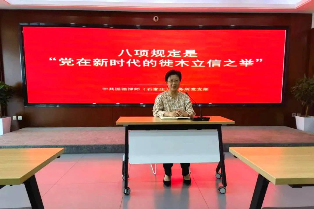 6月28日上午,國(guó)浩石家莊黨支部召開(kāi)黨員大會(huì),國(guó)浩執(zhí)行合伙人、國(guó)浩石家莊黨支部書(shū)記徐文莉以《八項(xiàng)規(guī)定是“黨在新時(shí)代的徙木立信之舉”》為題進(jìn)行專題授課輔導(dǎo)。國(guó)浩石家莊全體黨員、入黨積極分子參加。