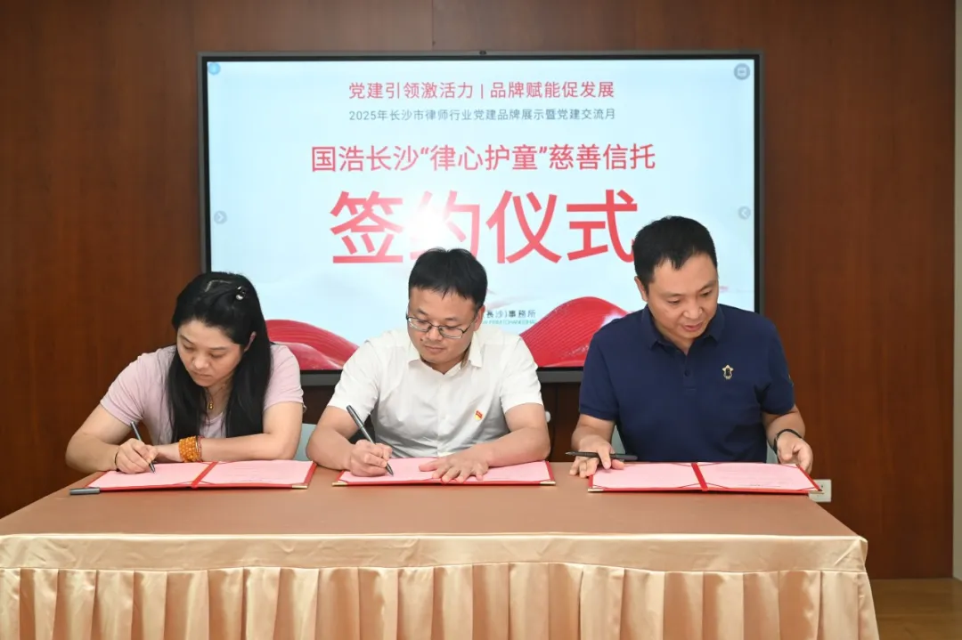 2025年8月29日,長沙市律師行業(yè)黨委、長沙市律師協(xié)會主辦的2025年長沙市律師行業(yè)黨建品牌展示暨黨建交流月活動盛大起航。9月12日上午,國浩律師(長沙)事務(wù)所(以下簡稱“國浩長沙”)承辦的分會場活動成功舉辦,活動分享了國浩長沙將黨建融入律所管理的工作經(jīng)驗(yàn),著重介紹了“法渡益行·黨潤心扉”黨建品牌項(xiàng)目,并舉行了“國浩長沙律心護(hù)童慈善信托”合作備忘錄簽約儀式。