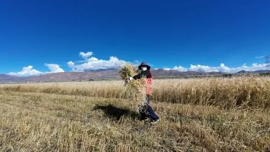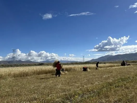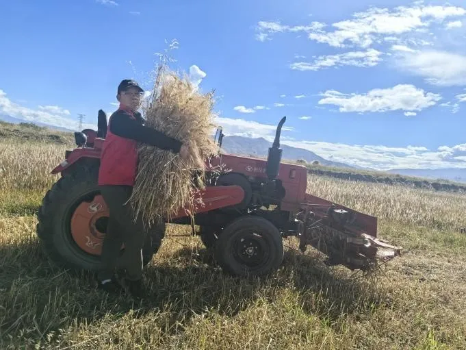活動現場,志愿者們身著統一志愿服裝、佩戴手套,迅速投入緊張有序的收割工作中:有的手持鐮刀,彎腰弓背專注割麥,動作嫻熟利落;有的主動配合農戶搬運成捆的青稞,在田埂間往返穿梭;有的協助操作農機設備,精準完成脫粒等環節;還有的細心俯身,將散落田間的青稞穗一一撿起。大家分工明確、默契配合,田間地頭處處是忙碌的身影,陣陣歡聲笑語與農機轟鳴聲交織,匯成一幅生動的“助農豐收圖”。