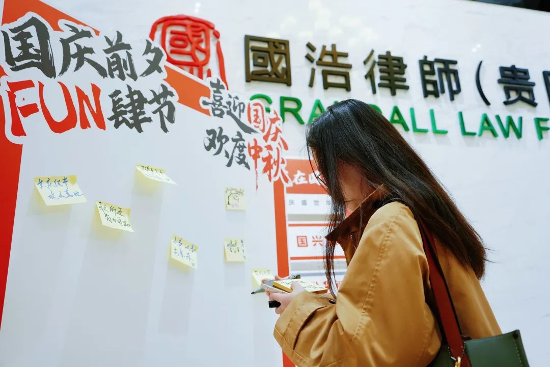 當日上午,國浩貴陽辦公室內充斥著喜慶祥和的節日氛圍,精心布置的活動區域成為大家爭相打卡的 “熱門地點”。大家紛紛駐足流連,或與“歡度國慶”主題背景板合影,或在“我向祖國送祝福”簽名墻前執筆抒懷。那些飽含深情的祝福語,不僅是對祖國76華誕的赤誠獻禮,更折射出法律人對家國情懷的深刻詮釋,字里行間涌動著對法治中國的堅定信仰,對民族復興的美好憧憬。
