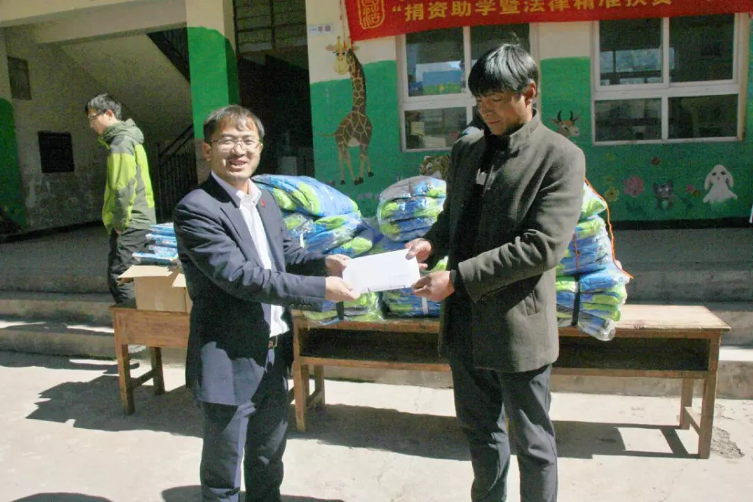 此次活動由國浩昆明管理合伙人、主任浦理斌,國浩昆明黨支部副書記聶智興,宣傳委員楊繼軍帶隊。由八名律師組成的團隊經過兩天的綿延山路,長途跋涉800余里,于2018年10月15日到達水草壩小學。浦理斌、聶志興等律師代表國浩昆明黨支部將捐獻的物品一一分發到孩子們的手中。同時,各位律師代表還向校長和老師轉交了國浩昆明律師們給孩子們補助過冬食物的款項,并致以誠摯的關懷。