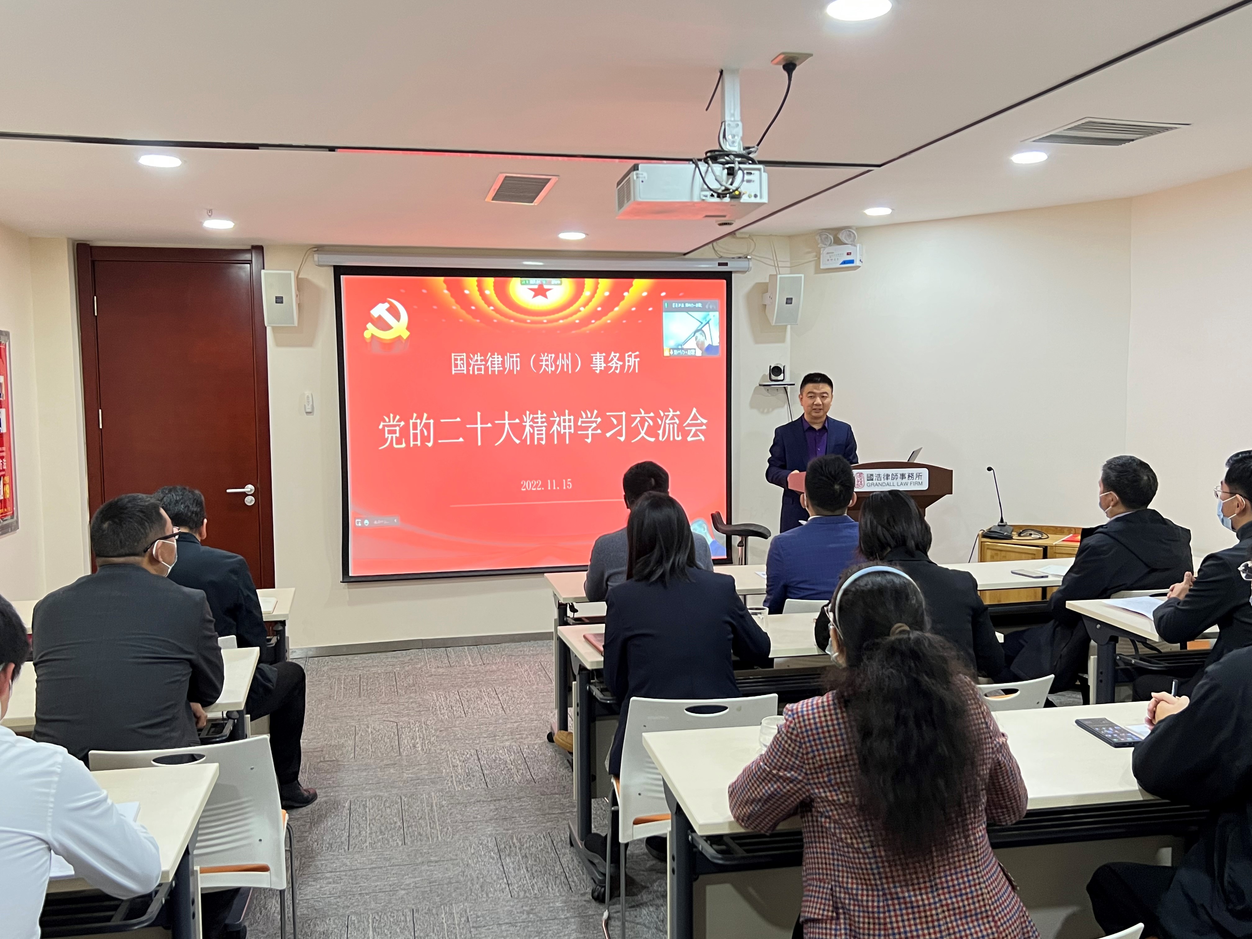 為了深入學習宣傳貫徹黨的二十大精神,2022年11月15日,國浩鄭州黨支部本著“學習不能誤、形式要多樣、內容要豐富、成效要顯著”的原則,創新活動開展形式,通過線下線上“同頻”發力的方式,組織召開了“黨的二十大精神學習交流會”。國浩鄭州黨支部書記、管理合伙人李國旺主持了會議,國浩鄭州管理合伙人、主任宋釗線上參會并作重要講話,國浩鄭州全體人員參加了學習。