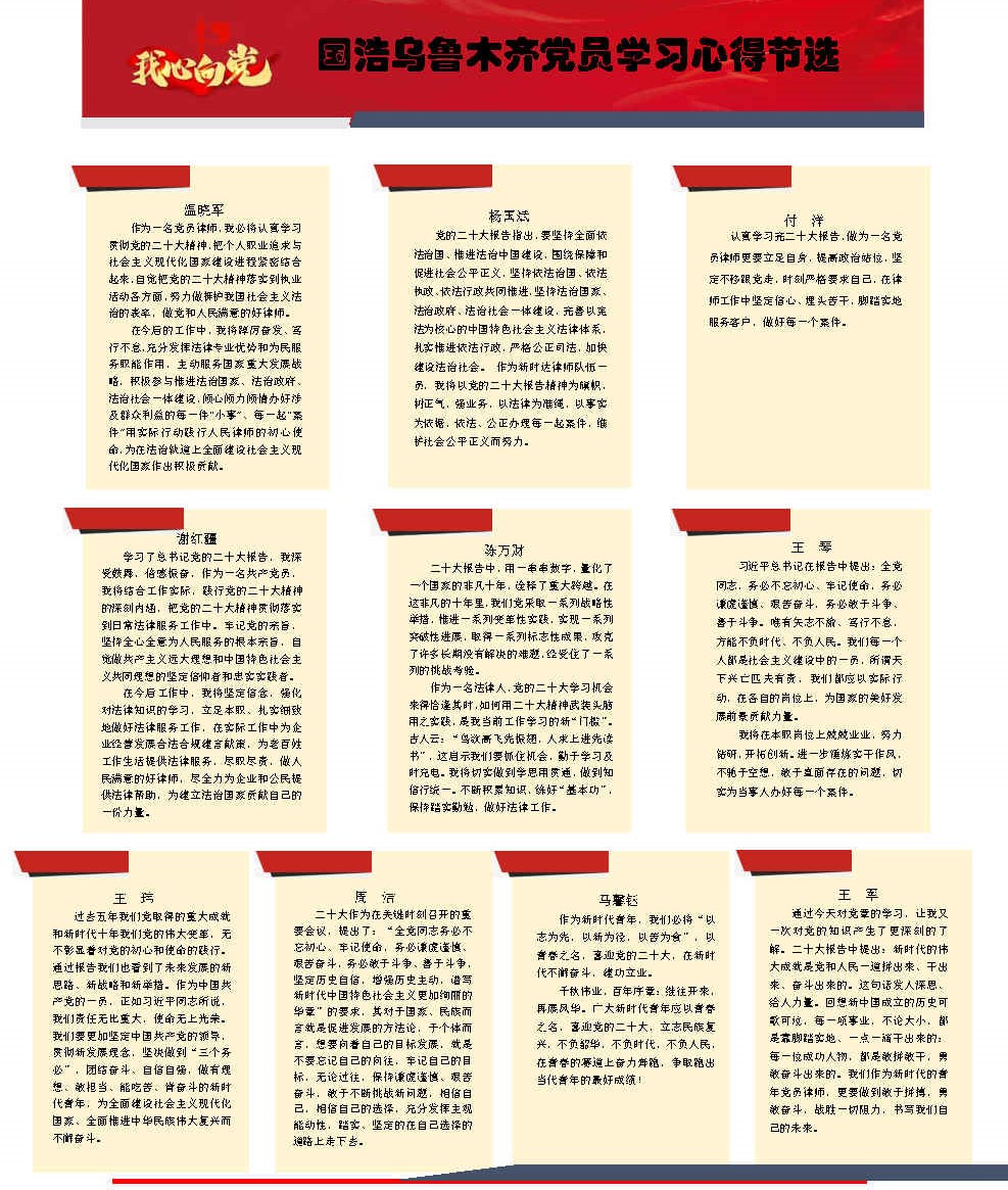此外,國(guó)浩烏魯木齊黨支部還于11月3日下午召開(kāi)了“堅(jiān)持依法治國(guó),推進(jìn)法治建設(shè)”專題會(huì)議。國(guó)浩烏魯木齊全體黨員認(rèn)真學(xué)習(xí)了黨的二十大報(bào)告中關(guān)于“堅(jiān)持依法治國(guó) 推進(jìn)法治建設(shè)”的內(nèi)容。溫曉軍書(shū)記和國(guó)浩烏魯木齊合伙人付洋、謝紅疆、陳萬(wàn)財(cái),律師楊國(guó)斌、王琴、王瑋、周潔,律師助理馬馨鈺、王軍等國(guó)浩烏魯木齊黨員分享了學(xué)習(xí)心得。