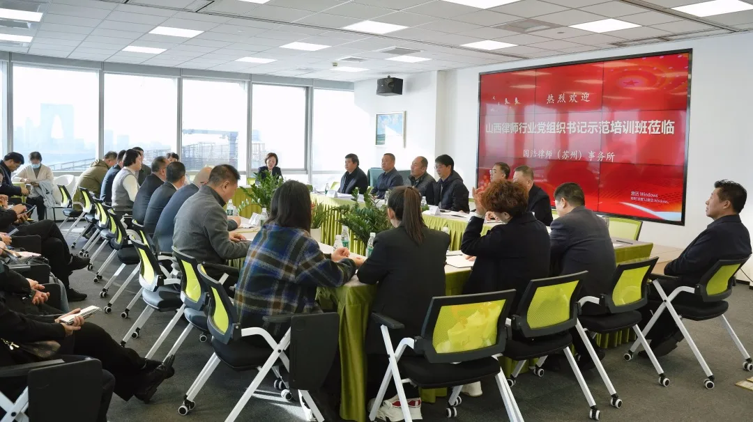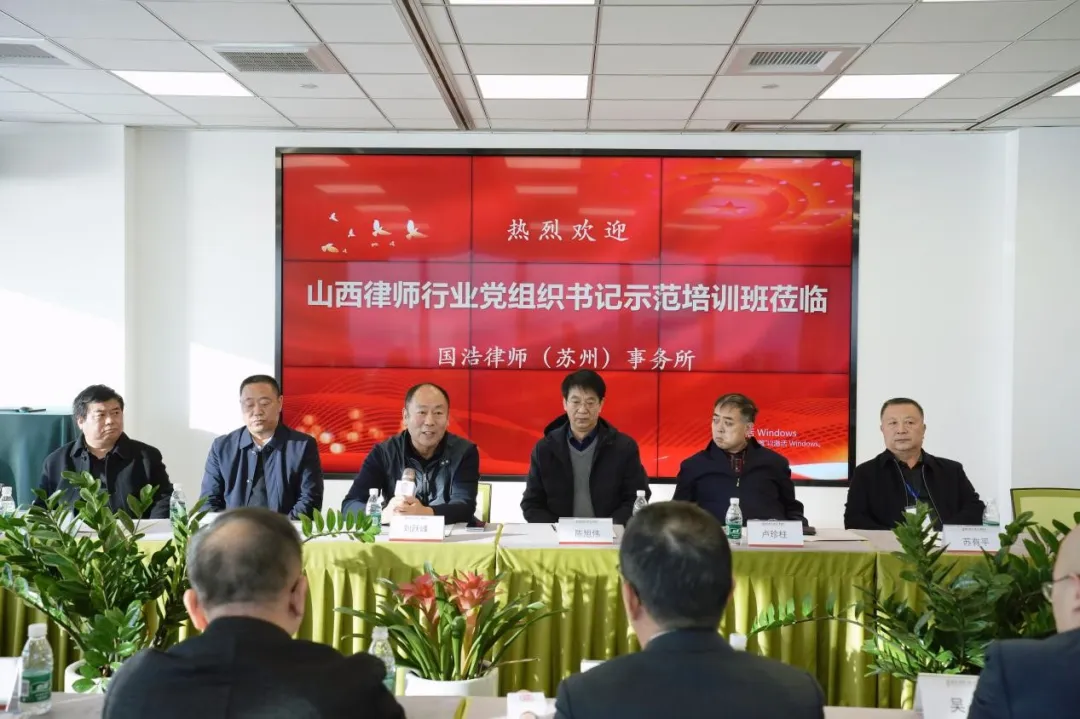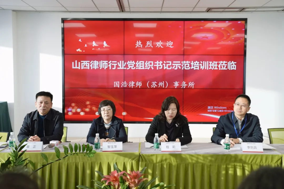 11月26日下午,山西省律師行業黨組織書記示范培訓班一行八十余人在山西省律師行業黨委委員、山西省律師協會副會長劉躍峰、裴正的帶領下,蒞臨國浩蘇州參觀交流。蘇州工業園區司法局副局長吳碩希,國浩蘇州黨總支書記、合伙人葛霞青,國浩蘇州合伙人袁春其,國浩蘇州黨總支副書記、合伙人陳靜瑤,國浩蘇州第二黨支部書記、合伙人吳鑫,國浩蘇州青年律師工作委員會主任、合伙人余超熱情接待并出席座談會。