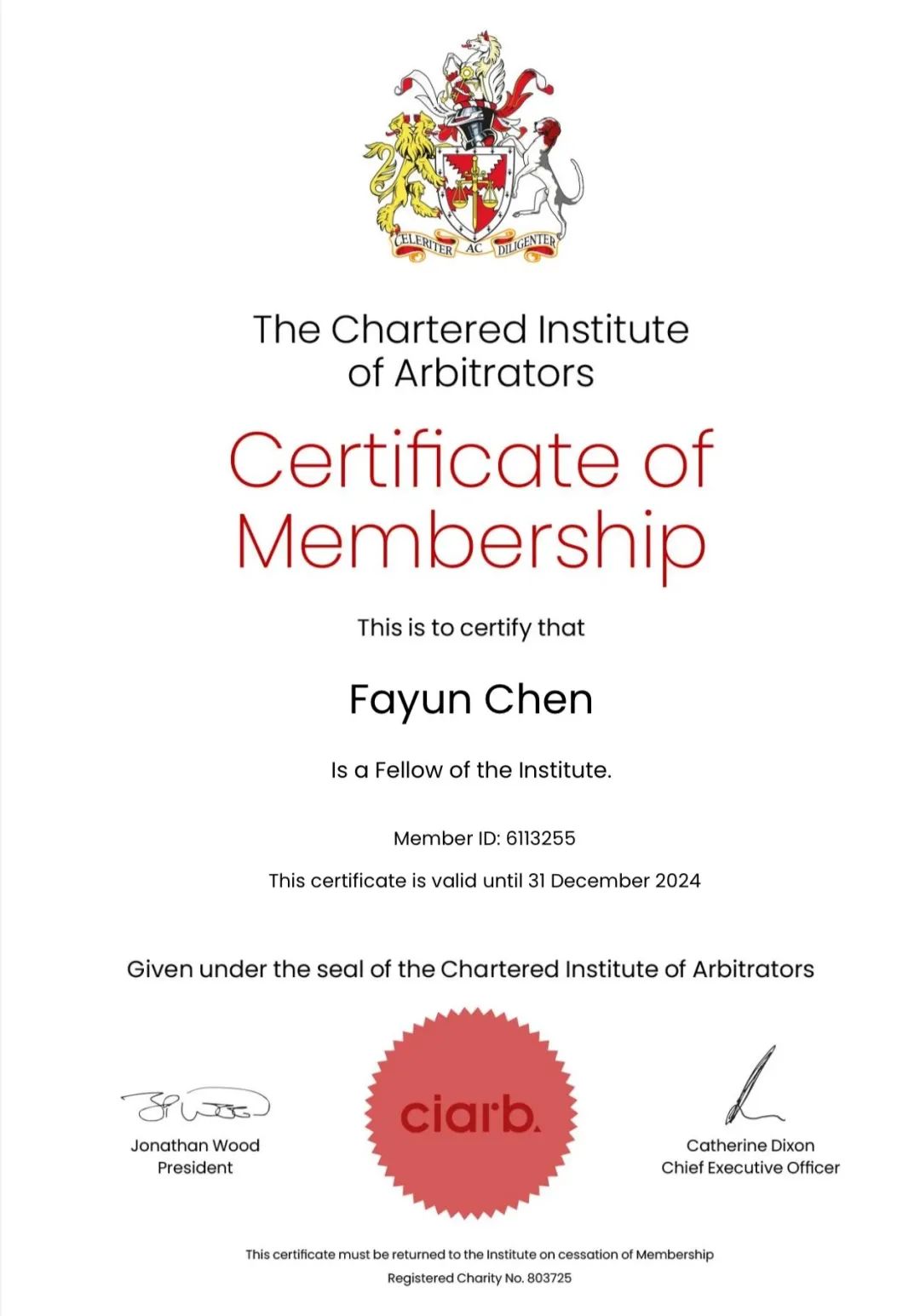 Walter Fayun CHEN Achieved Fellow of the Chartered Institute of Arbitrators