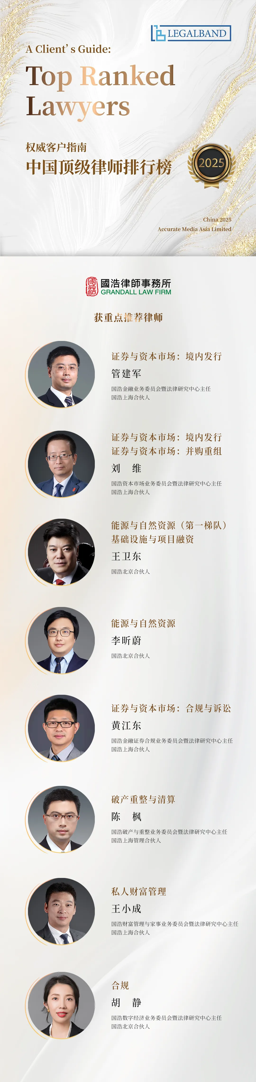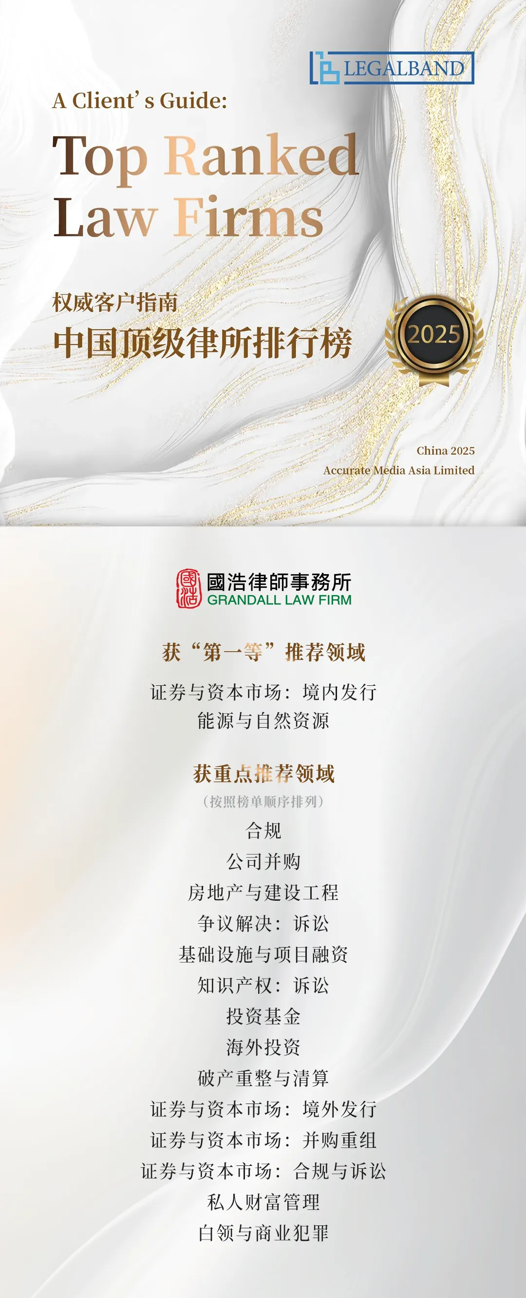 On 22 April 2025, LEGALBAND, a renowned legal rating agency, announced the 2025 LEGALBAND Top Ranked Law Firms and Top Ranked Lawyers.  Grandall has been honored the Top Ranked Law Firm for exceptional performance in the market.  Specifically, in the Securities and Capital Markets: Domestic Issuance, it has been recommended as First Tier for seven consecutive years while the ranking in the Bankruptcy Reorganization and Liquidation has been promoted to the Second Tier.  Compliance and Real Estate and Construction have newly made the list.
