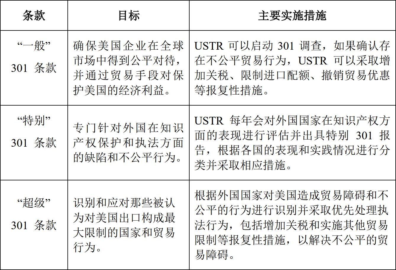 從下表中可以比較直觀的看出三種“301條款”所分別針對的目標以及主要事實措施:
