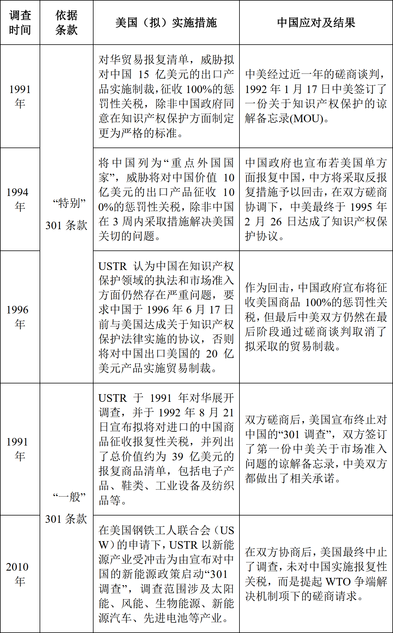 301調查是基于《1974年貿易法》第301條款展開的對外國國家(政府)的政策行為是否對美國貿易造成負面影響或限制的調查,這其實是美國政府慣用的一種貿易保護單邊主義法律工具。在2017年之前,美國已經對中國展開了五次301調查,其中依據“特別”301條款進行了三次調查,另外兩次是依據“一般”301條款開展的調查。下表是對這五次調查后美國(擬)對中國實施的措施以及中國采取的應對方式及最終結果的簡要匯總[注10]: