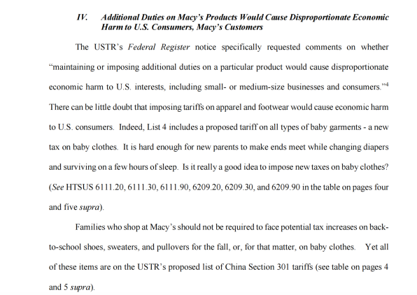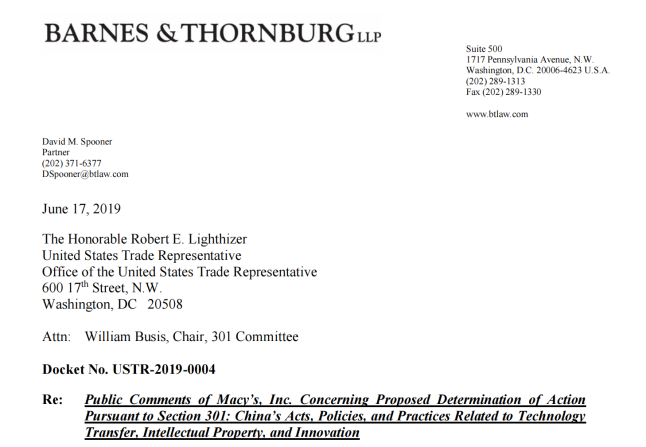 這份清單發布后,USTR針對主要問題向公眾公開征詢意見,這些問題包括清單中列出的產品是否應保留或從清單中移除、或者是否應對其他未在清單上的產品增加關稅等問題。USTR允許所有利益相關者,包括公司、貿易協會、消費者團體、學術機構、政府實體和個人對征稅清單提交意見和建議。在近一個多月的征詢開放期間內,USTR共收到了約3200份書面意見,除了涉及商業秘密的書面意見不予公開外,USTR公開了所有在征詢期間的書面意見。經筆者粗略查閱,大部分意見來自美國公司(包括美國領先零售商之一的梅西百貨(Macy’s))以及行業協會或機構(如美國通信工業協會(Telecommunications Industry Association,TIA))。在筆者隨機翻閱的10份由美國企業提交的意見書中,這些企業對于擬征稅清單中涉及自身行業要加征關稅的產品都提出了排除申請并列出了詳細的理由。此外,這些企業幾乎都提到美國對中國產品加征關稅的行為不僅會對美國本土企業的發展以及美國消費者造成嚴重的負面影響,而且這些企業也都表現出擔心中國會出臺對美國產品加征關稅的反制行為。有趣的是,在筆者翻閱意見書的時候還發現了一封來自中國某高校國際貿易法學副教授提交的意見,該教授除了提出應該將鋼鐵和鋁制品項下的相關產品排除在征收清單外,還強調美國應通過加強中美兩國對話和合作以解決雙方在國際貿易的爭端。