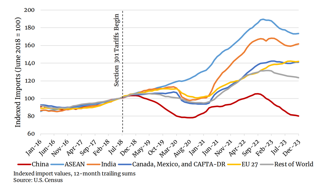 上圖顯示了包括中國和各個貿易伙伴和地區的所有美國商品進口(按價值)的指數增長情況,其中進口水平以2018年7月(301條款關稅生效前的月份)為基準,展示了在征收關稅后中國向美國進口的顯著變化。