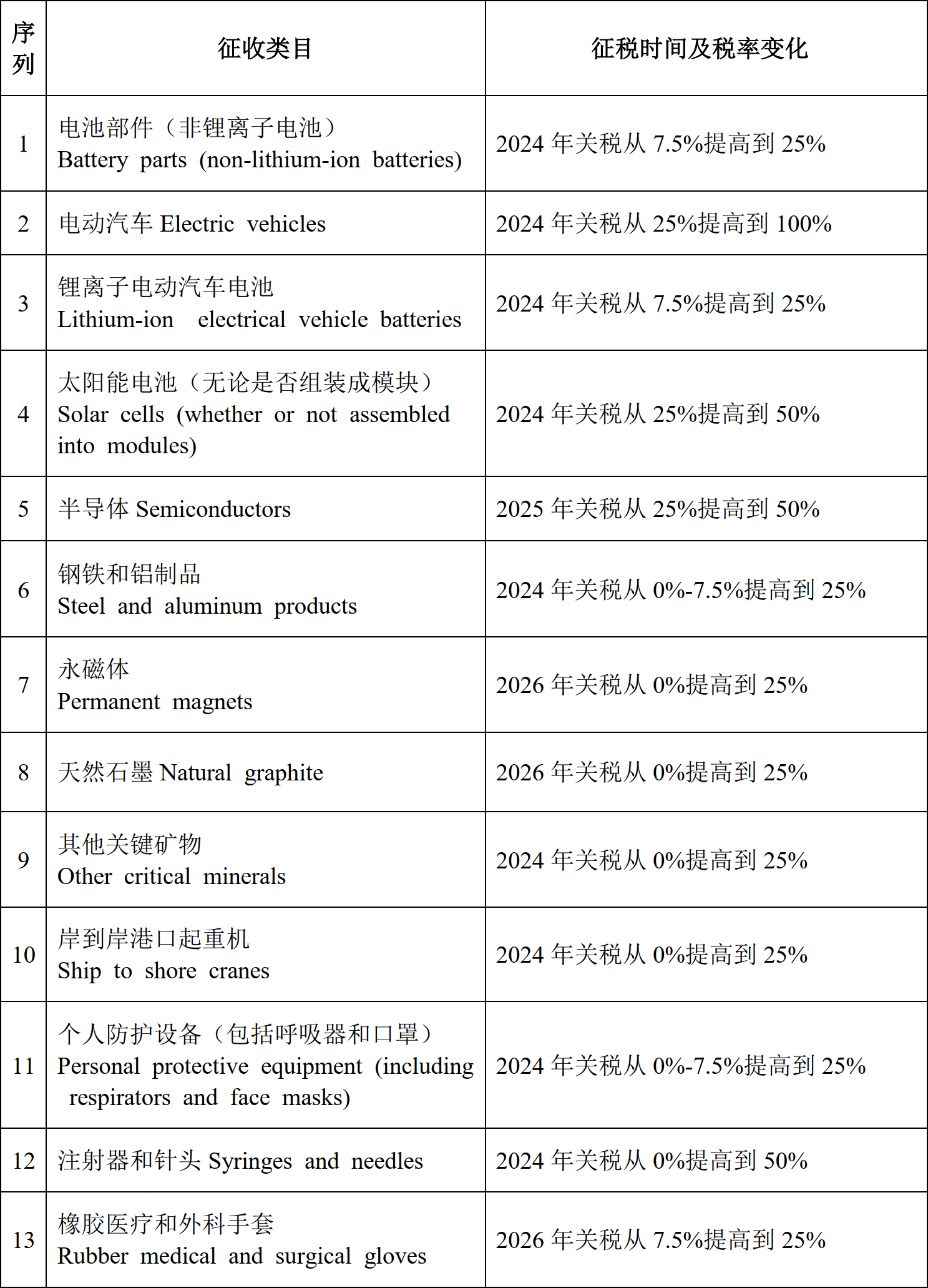 上表中有一部分類目已在之前的加征關稅清單中,也有一些類目是此次新增,而之前受301條款關稅覆蓋的其他產品將繼續按現行稅率征收。根據USTR在5月22日發布的最新公告,在2024年增加稅率征收的關稅類目將在今年8月1日起實施,而其他在2025年以及 2026年增加征收的關稅類目將于相應年度的1月1日起實施[注22]。USTR表示,其針對上述行業采取行動的原因是中國尋求擴大這些產品的市場份額的行為與美國正投資擴大其自身的市場份額相沖突,并在一定程度上對美國本土產業發展造成了限制和負面的影響。USTR認為征收關稅的行為是對美國補貼政策的補充,并稱這些關稅將進一步鼓勵美國公司在綠色能源和半導體供應方面實現多元化,從而減少對中國的依賴[注23]。