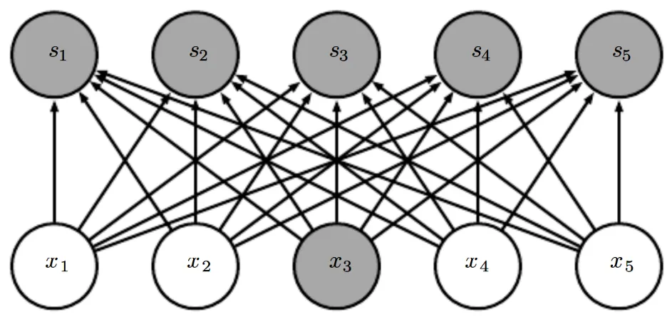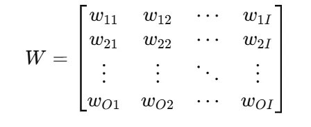 對于這樣的一個神經網絡,其參數量N=I*O,技術附注中的例子還進一步假設了在反向傳播時不對偏置進行計算。則其參數矩陣僅由權重組成,如下圖所示: