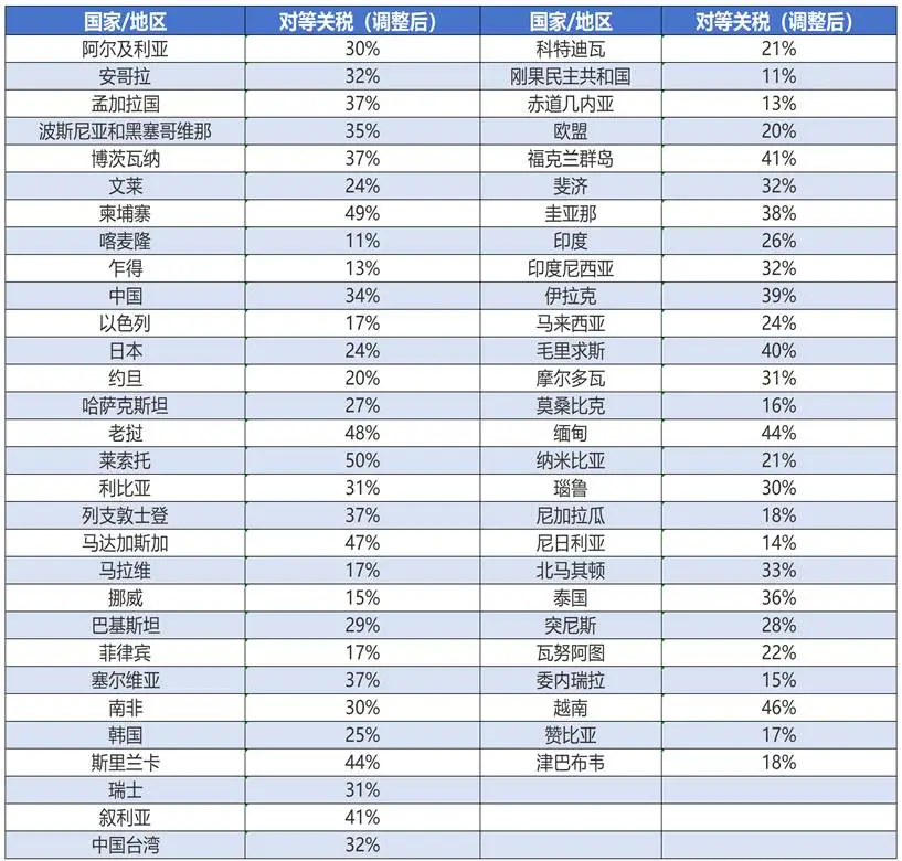 根據行政令附錄一,該關稅適用于包括中國在內共計57個國家和地區。具體如下:[注2]