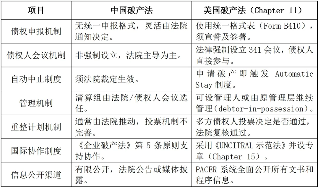 1. 法律體系的顯著差異。美國破產法強調程序正義和債務人重整機會,設有automatic stay、債權人會議等機制,無擔保債權人保障有限;而中國程序對無擔保債權人較友好,但參與度和異議機制較弱,導致中國債權人進入美方程序常感不適應。
