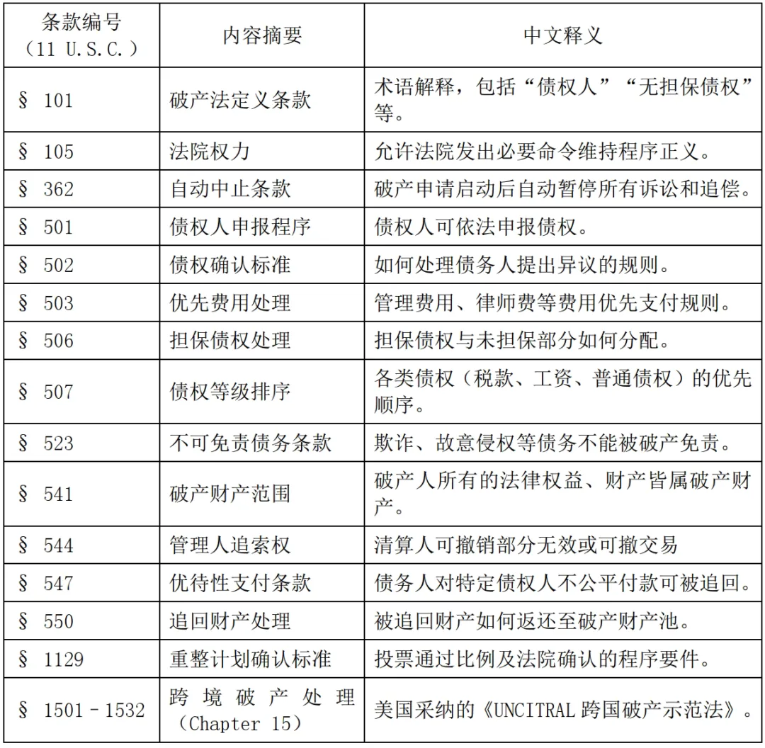 美國破產法的法律基礎《破產法典》(U.S. Bankruptcy Code)是聯邦法律(《美國法典》第11編),適用于全美所有破產案件。中國債權人最常遇到的程序是: