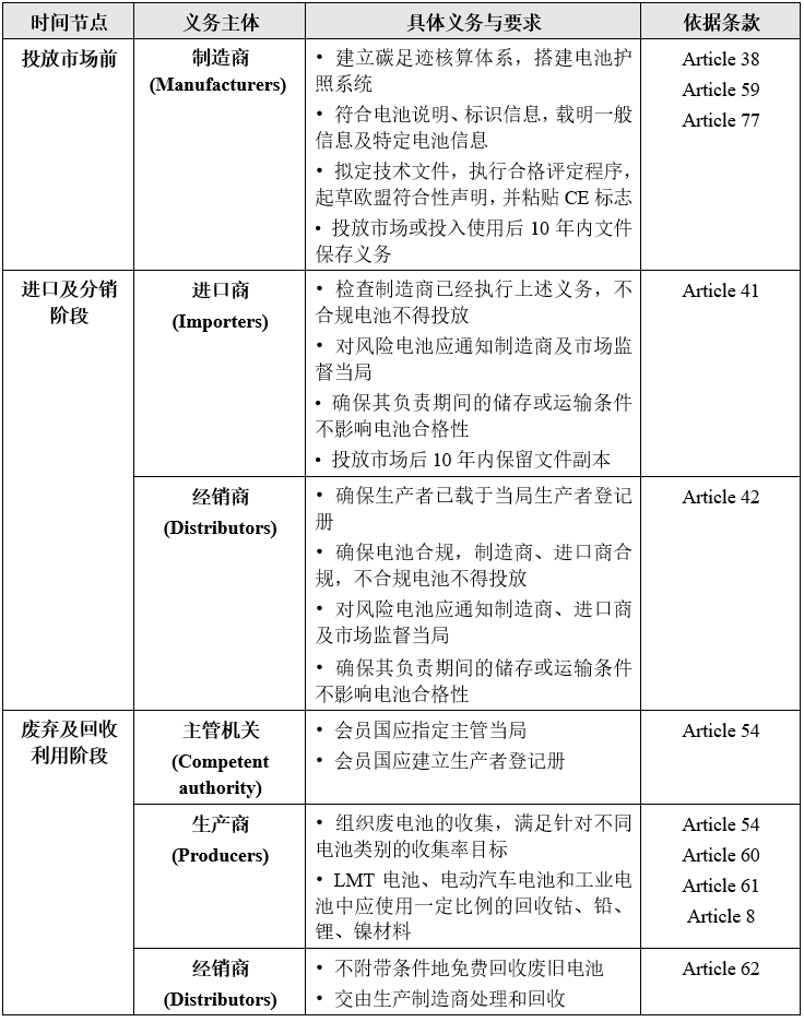 該法規(guī)制定一套從電池的“出生”到“死亡”全產(chǎn)業(yè)鏈條標準,涵蓋了從電池的設計、生產(chǎn)、銷售、使用、回收、報廢全生命周期各環(huán)節(jié),包括可持續(xù)性、安全、標簽、標記和信息披露等方面的規(guī)則。因此,在產(chǎn)業(yè)鏈上各中國企業(yè)主體均應當明確具體法規(guī)要求以自身應當承擔的責任,以便相關產(chǎn)品能夠在歐盟市場上合法合規(guī)出口與銷售。