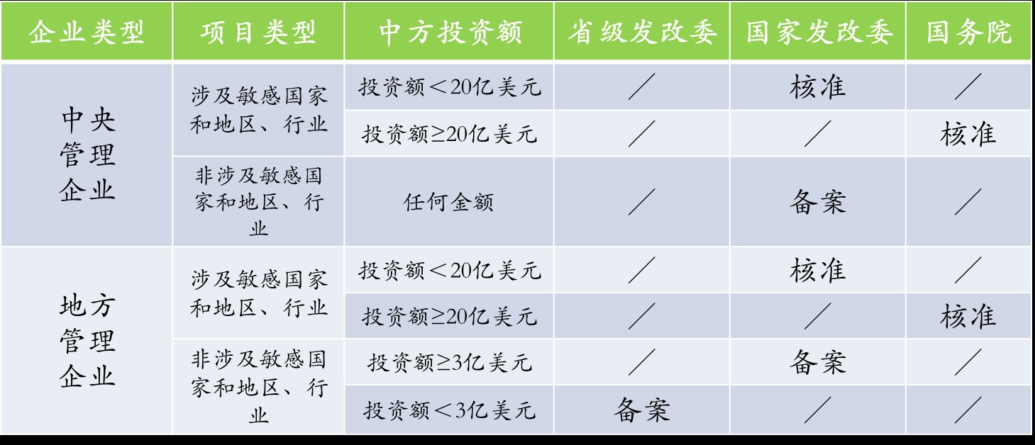 2014年4月,發改委頒布《境外投資項目核準和備案管理辦法》(2014年國家發展和改革委員會令第9 號),發改委對境外投資的監管分為核準及備案管理兩類: