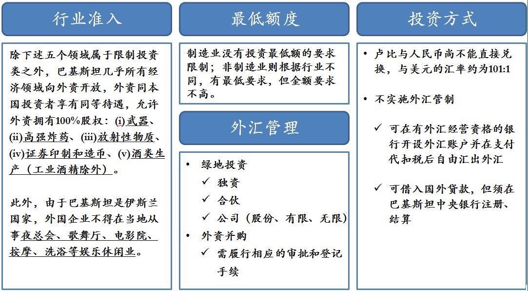 《1947年外匯管制法》、《1976年外國私人投資(促進與保護)法案》、《1984年公司法》、《1992年經濟改革保護法案》、《1997年公司(法院)規則》、《2001年私有化委員會法》、《2001年投資委員會法令》、《2001年外匯賬戶(保護)法案》、《2007年競爭(并購控制)條例》、《2010年競爭法》、《2012年特殊經濟區法》、《巴基斯坦投資政策2013》、聯邦和各省、直轄區政府不時頒布、修改的投資優惠政策和私有化政策等。