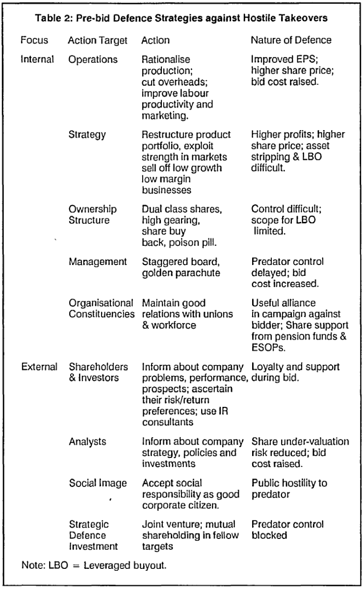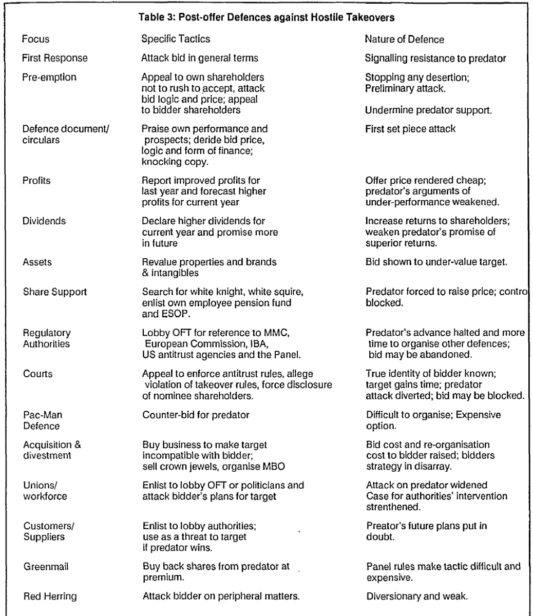 (source: Dr P.S. Sudarsanam, (1991) "Defensive Strategies of Target Firms in UK Contested Takeovers", Managerial Finance, Vol. 17 Issue: 6, pp.47-56)
