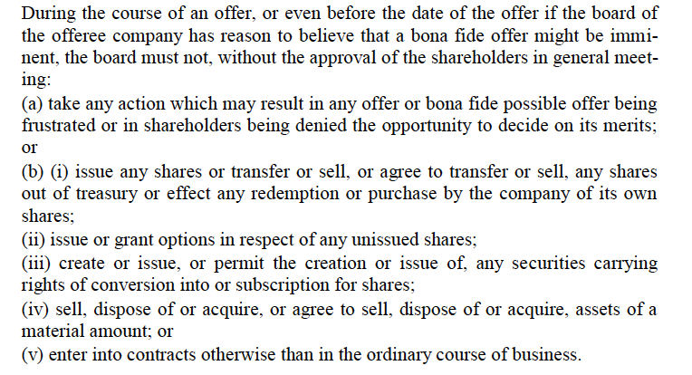 同時,《守則》規(guī)則第21(Rule 21)條規(guī)定“當(dāng)一項真誠的要約已經(jīng)提交給受要約公司董事會,或者受要約公司董事會有理由相信即將發(fā)生一項真誠的要約時,受要約公司董事會不得采取任何行動,在效果上令該項要約受到阻撓或使受要約公司股東被剝奪了根據(jù)要約利弊決定是否接受要約的機會。除非受要約公司的股東在公司股東大會上通過決議同意采取此項行動。”特別是“受要約公司董事會未經(jīng)股東大會批準(zhǔn),不得1.發(fā)行任何股份,或轉(zhuǎn)讓或出售,或同意轉(zhuǎn)讓或出售股份,或者由公司贖回或購買公司股份;2.就任何未發(fā)行股份予以發(fā)行或提予期權(quán);3.創(chuàng)設(shè)或發(fā)行、或準(zhǔn)許創(chuàng)設(shè)或發(fā)行任何證券,而該證券是附有轉(zhuǎn)換為該公司股份或認(rèn)購該公司股份的權(quán)利;4.出售、處置或取得,或同意出售、處置或取得具有重大價值的資產(chǎn);5.在日常業(yè)務(wù)過程以外訂立合同等。”(注:筆者譯)