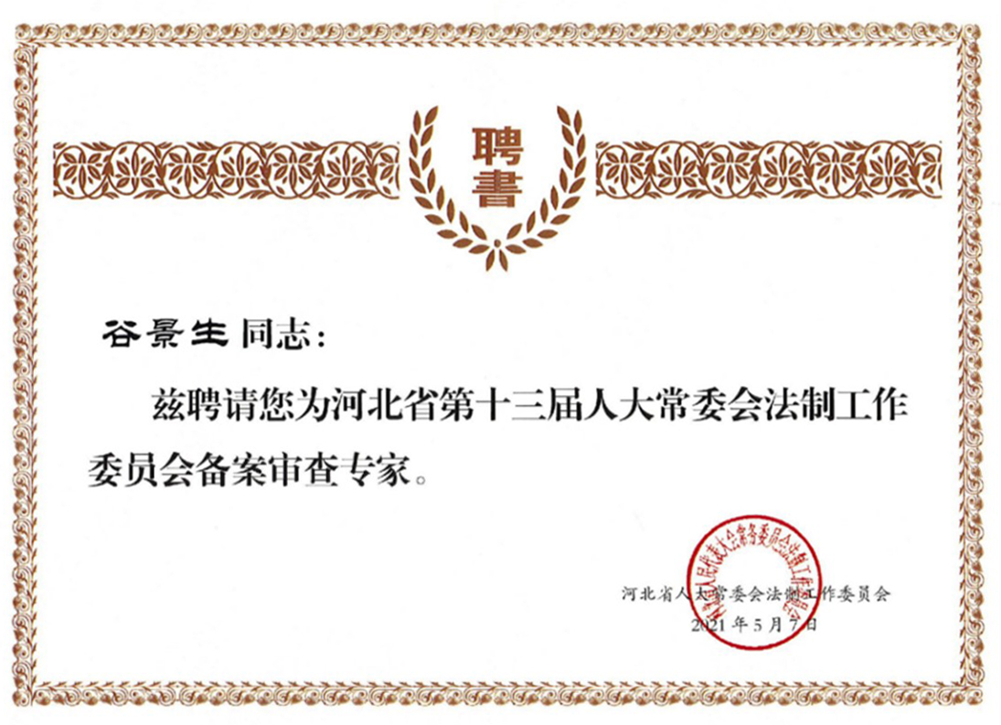 谷景生律師同時擔(dān)任河北省第十三屆人大常委會法制委專家顧問,多年來積極參與《民法總則》《民法典》等多部法律法規(guī)等立法征求意見工作,獲得業(yè)界一致認可和好評。