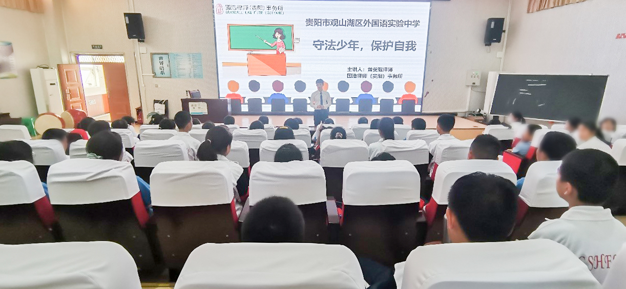 為增強學生法律觀念,自2021年5月13日起,國浩貴陽指派夏曉云、涂丹、譚琪等10位國浩貴陽律師分別前往貴陽市觀山湖區第五中學、林東中學、外國語實驗中學、中加國際學校等15所學校,為700余名學生送去《民法典》《未成年人保護法》等法律法規講座專場,助力未成年人提升依法自我保護的能力與意識。