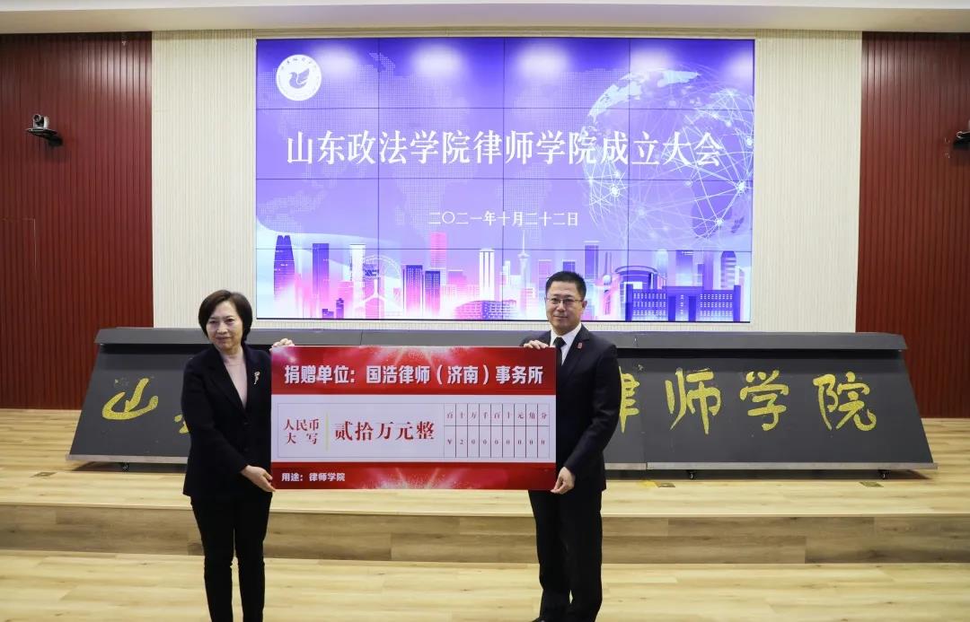 成立大會上,國浩濟南與山東政法學(xué)院簽訂了建設(shè)協(xié)議書,并捐贈二十萬元作為首批建設(shè)資金。山東政法學(xué)院律師學(xué)院采取“1+N+N”運行模式,基于學(xué)校和山東省律師協(xié)會的合作協(xié)議,學(xué)校對接N個律師事務(wù)所,分別開設(shè)N個專業(yè)特色培養(yǎng)班,各班次采取微專業(yè)辦學(xué)模式,面向法學(xué)專業(yè)高年級學(xué)生、研究生和社會律師招生,旨在推動山東政法學(xué)院和律師行業(yè)實現(xiàn)產(chǎn)教融合、協(xié)同育人,推進法治人才培養(yǎng)關(guān)口前移。