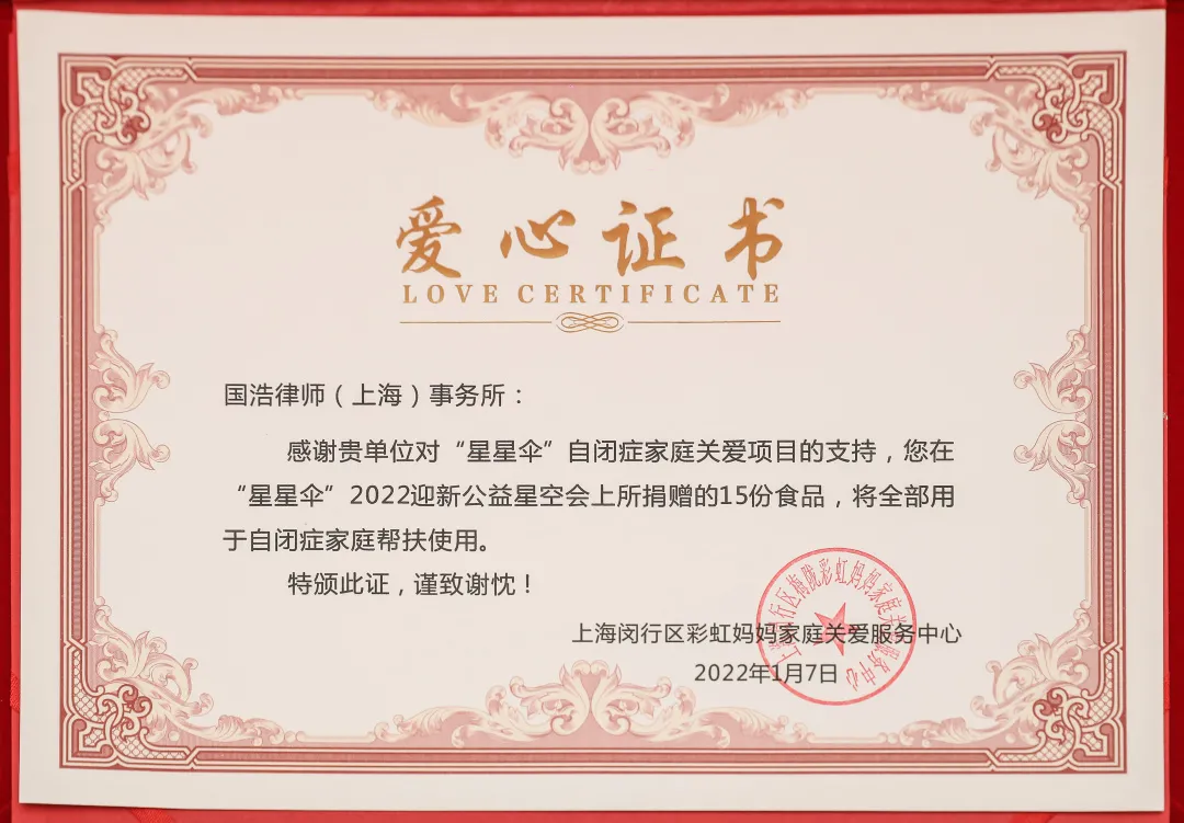 愛(ài)心傳遞溫暖,希望開(kāi)啟新年。國(guó)浩上海將繼續(xù)積極踐行社會(huì)責(zé)任,通過(guò)加強(qiáng)同慈善組織的合作、創(chuàng)新公益法律服務(wù)等方式,用專業(yè)力量和實(shí)際行動(dòng)為我國(guó)慈善事業(yè)發(fā)展、保障弱勢(shì)群體合法權(quán)益貢獻(xiàn)力量。
