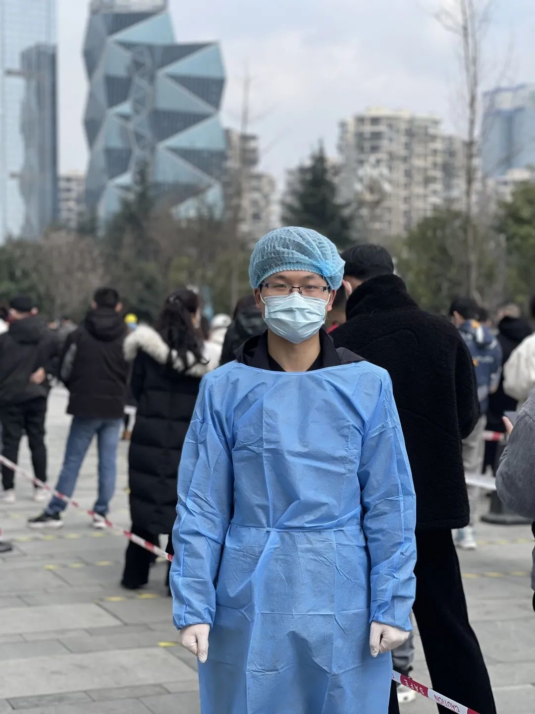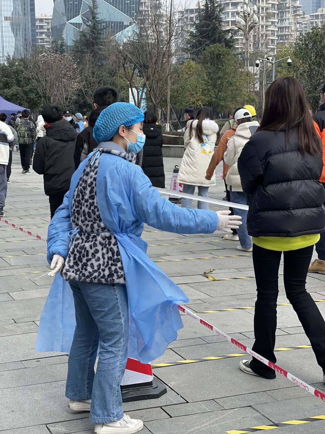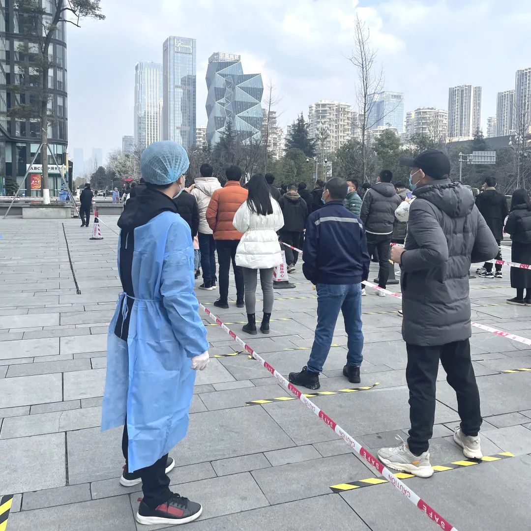 “請聽從工作人員安排、保持一米間距……”在高新區國際人才城核酸監測點,大喇叭里正循環播報著溫馨提示。國浩成都黨員律師身著藍色防護服,和其他參與抗疫的志愿者一起,布置現場、維持秩序、引導居民掃碼、幫助醫護人員登記居民身份信息。中間沒有絲毫休息,一批居民離去,陸續趕來的居民又不斷匯集起來,直至夜幕降臨,志愿者們才紛紛找地方休息,不時捏腰捶腿,緩解疲勞。