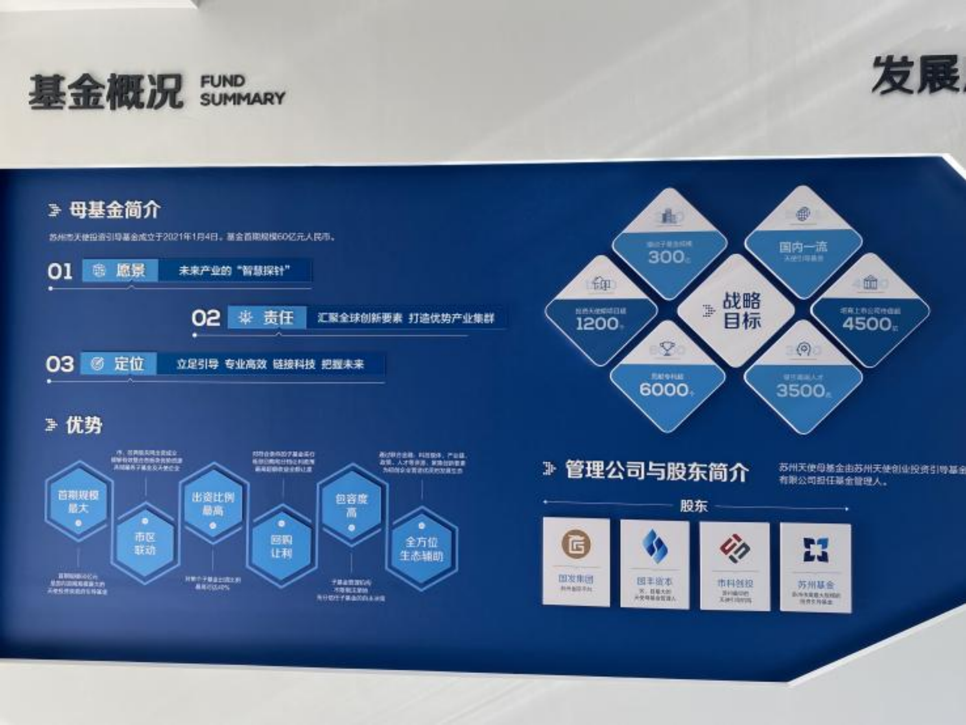 蘇州市天使投資引導基金成立于2021年1月,基金首期規模高達60億元人民幣,主要投資數字經濟、新一代電子信息、高端裝備制造、新材料、軟件和集成電路、新能源和節能環保、醫療器械和生物醫藥等產業的子基金。蘇州天使母基金由蘇州天使創業投資引導基金管理有限公司擔任基金管理人,管理公司由蘇州國發集團、園豐資本、蘇州基金和蘇州市科創投共同發起設立。蘇州天使投資引導基金管理有限公司希望通過母基金運作、與市場化母基金合作等途徑,發揮資源集群效應,提升蘇州天使項目成功率,與高等院校、科研院所、重點實驗室等合作,攻克先導技術產業運用難題,帶動傳統制造產業轉型升級,同時為種子期、初創期企業提供資本對接、產投融合、投貸聯動等全鏈條服務,幫助科技創業者成功創業。