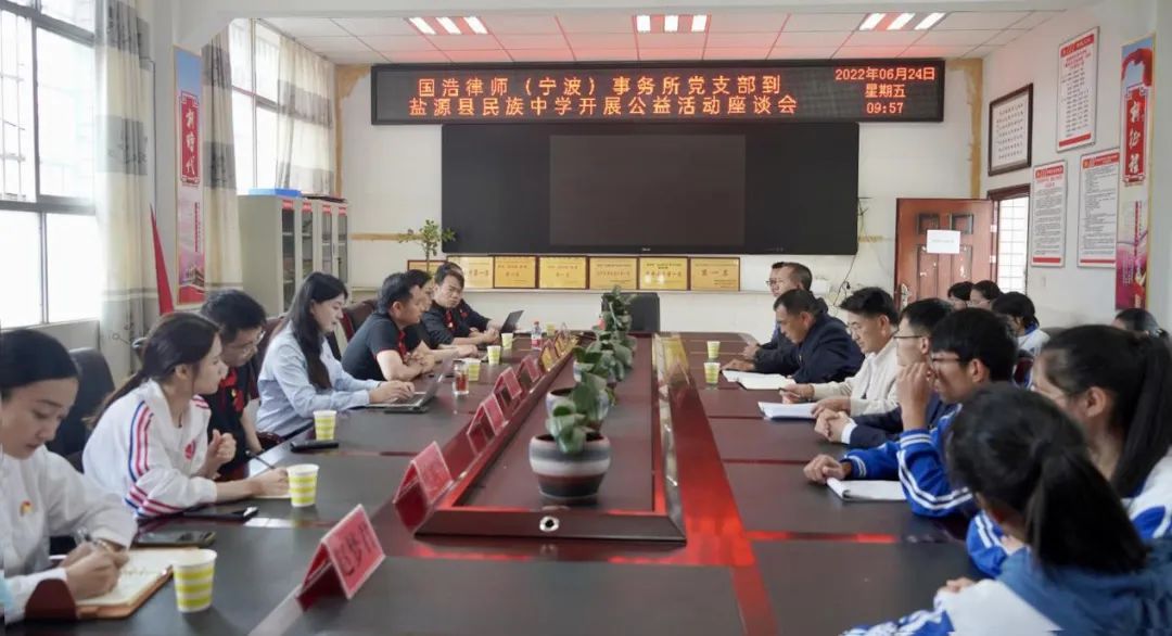 6月24日,國浩寧波黨支部一行在國浩寧波黨支部書記、合伙人方坤富的帶領下,來到鹽源縣民族中學實地走訪并開展交流座談會。校黨委書記、校長胡聰元,校黨委委員、副校長代軍偉,校資助辦主任劉德華,相關老師以及受助學生參加會議。