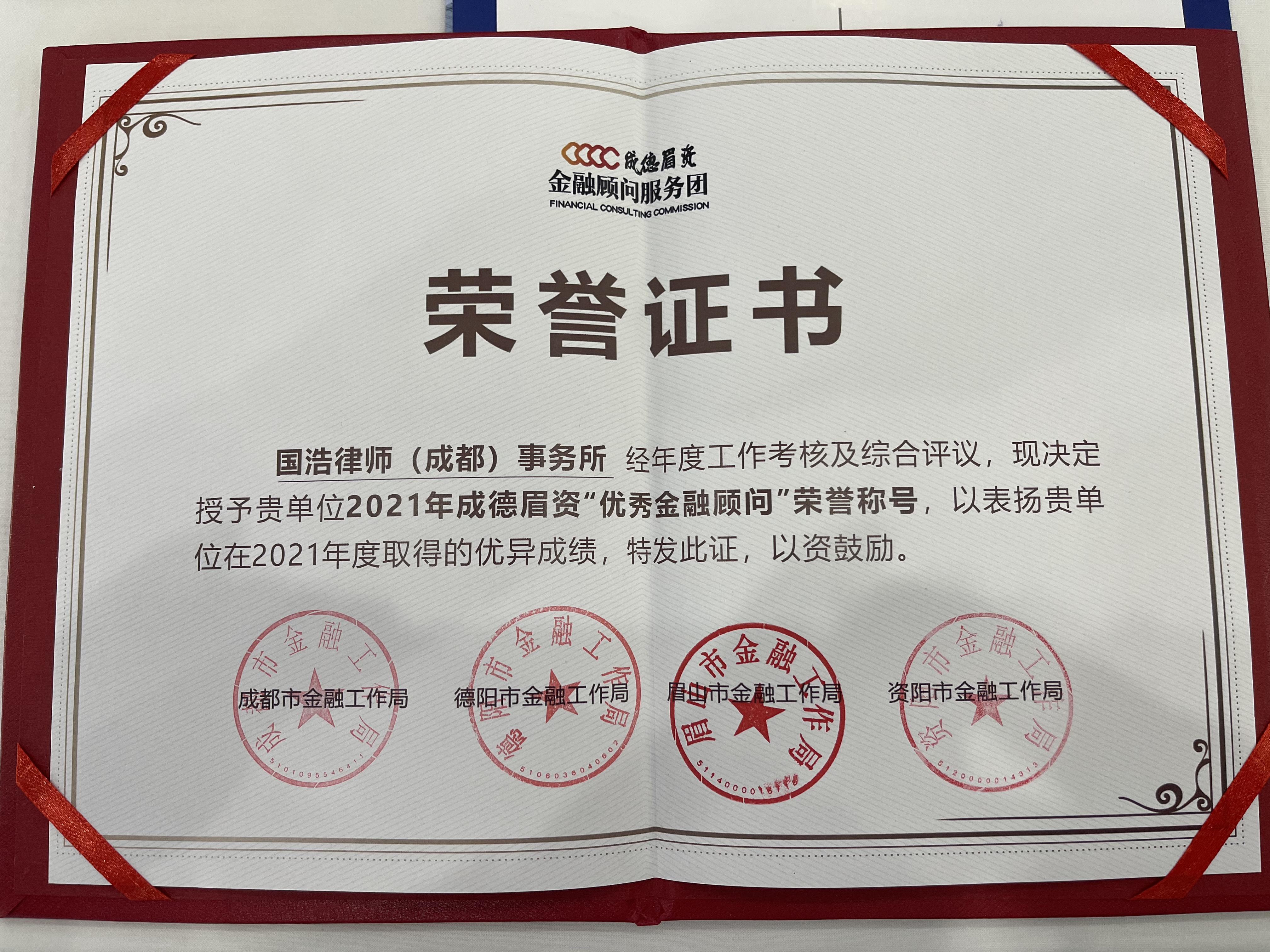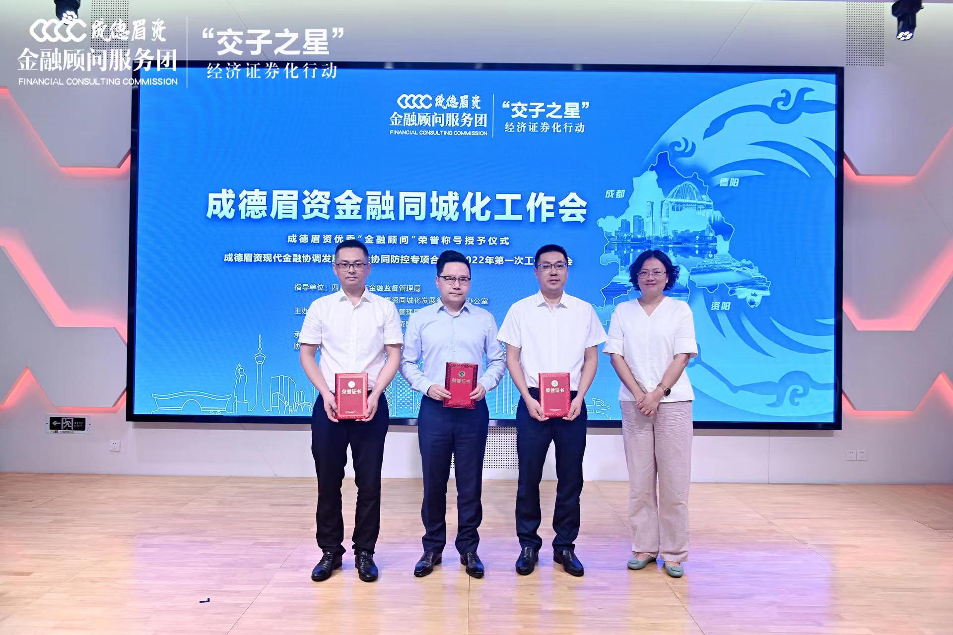 為穩步推進成德眉資同城化發展,在四川省地方金融監督管理局、四川省同城化辦公室的指導下,2022年7月15日,成德眉資四市金融局在新三板西南基地舉行“交子之星”經濟證券化行動成德眉資金融同城化工作會。大會對成德眉資“金融顧問”服務團工作成果作了總結評議和展示,并對服務團成員單位進行了表彰。其中,國浩成都辦公室榮獲了2021年成德眉資“優秀金融顧問”榮譽稱號,國浩成都管理合伙人、主任劉小進代表國浩成都參會并領取了榮譽證書。