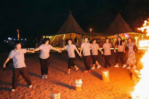 夜色降臨,月光與燈光交相輝映,海岸上燃起篝火,搖曳的火光照亮了每個人的臉龐,國浩大連家人們手拉著手繞著篝火跳舞歡唱,放下所有煩惱,只有生活的熱情與美好。