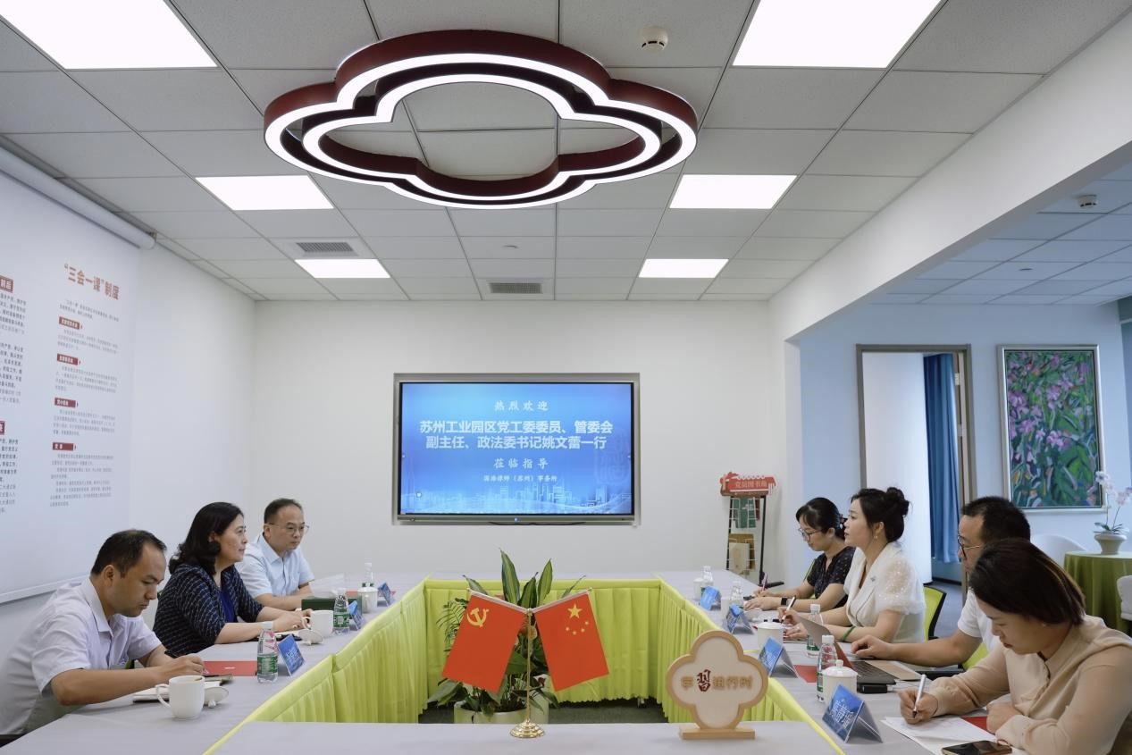 2022年8月24日下午,蘇州工業(yè)園區(qū)黨工委委員、管委會(huì)副主任、政法委書記姚文蕾一行蒞臨國浩蘇州調(diào)研指導(dǎo)工作并召開座談會(huì)。蘇州工業(yè)園區(qū)司法局副局長吳碩希、園區(qū)政法委司法處處長李京濤陪同調(diào)研。國浩蘇州黨支部書記、管理合伙人、主任葛霞青,管理合伙人郭豐雷、陳靜瑤,合伙人殷輝熱情接待,并在黨建會(huì)議室進(jìn)行了座談交流。