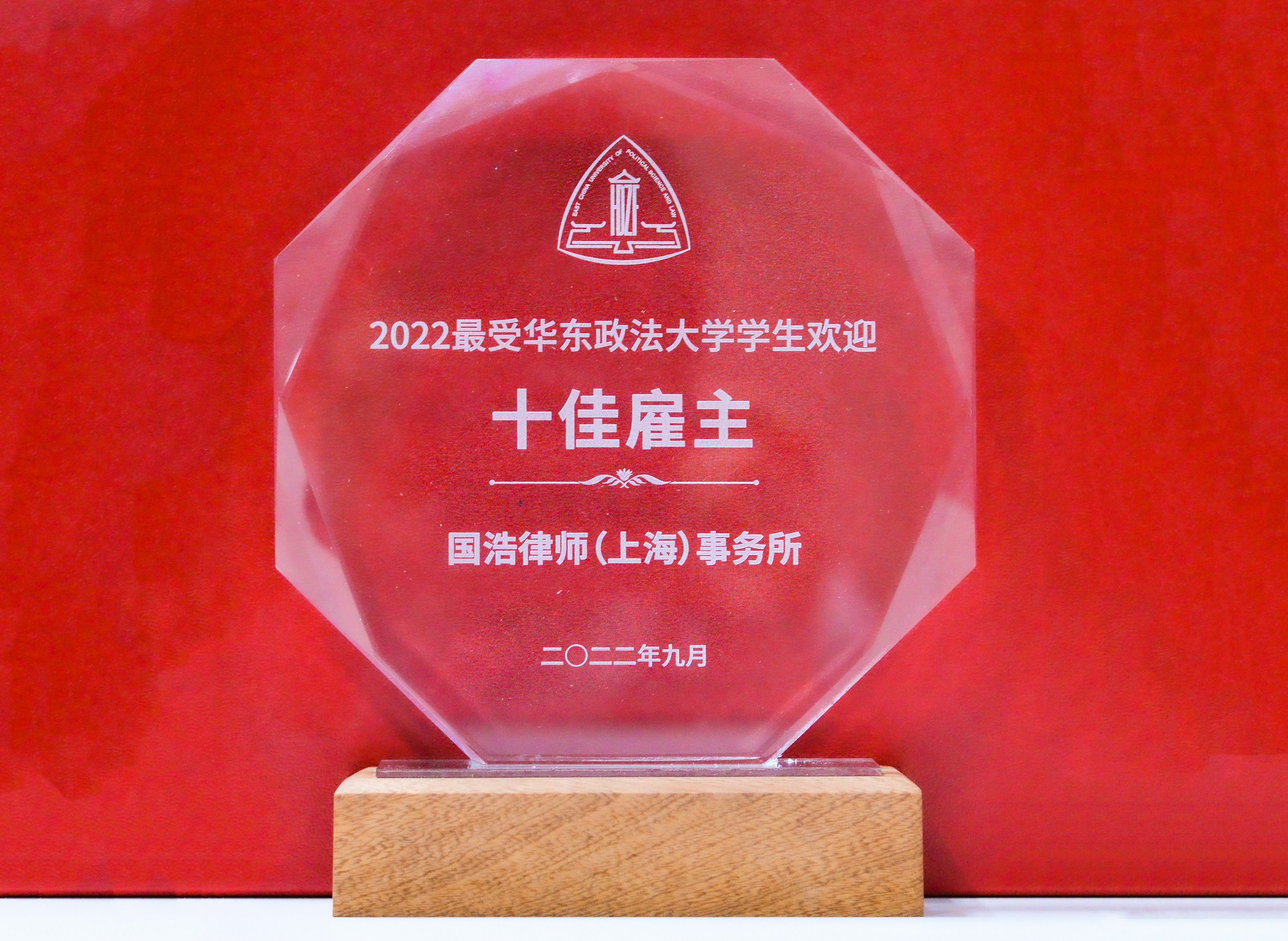 近日,華東政法大學(xué)學(xué)生就業(yè)中心結(jié)合應(yīng)屆畢業(yè)生的錄用人數(shù)、學(xué)生滿意度等方面評選出了2022最受華東政法大學(xué)學(xué)生歡迎“十佳雇主”,國浩上海辦公室成功獲評入選。