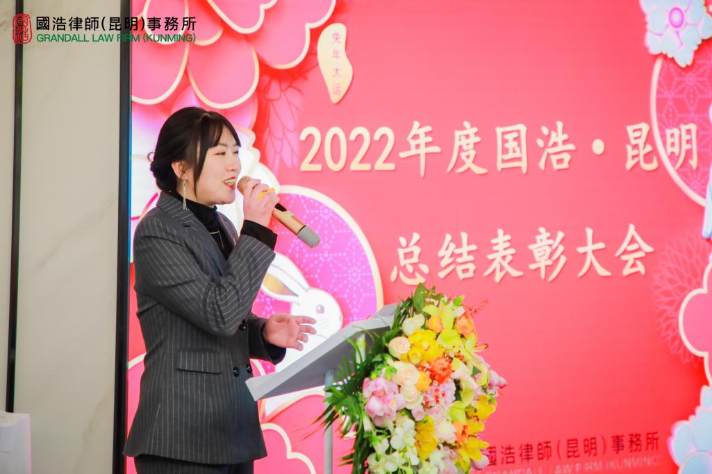 2022年,共有 86 名新員工加入了國浩昆明大家庭,他們為律所融入了新鮮血液,帶來了新的活力。國浩昆明律師張璐作為新員工代表發言并表示,感恩與國浩相遇,新的一年愿“懷揣熱愛,與國浩一起,奔赴下一場山海”。