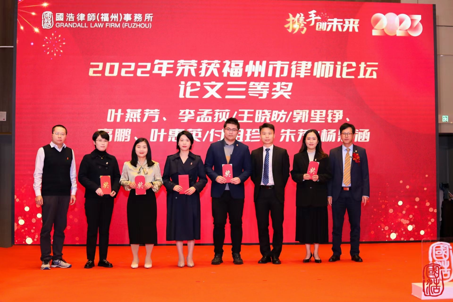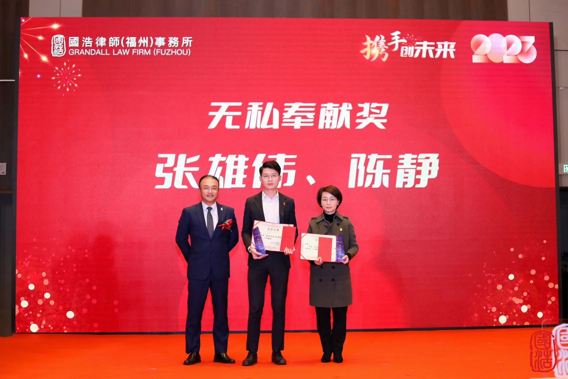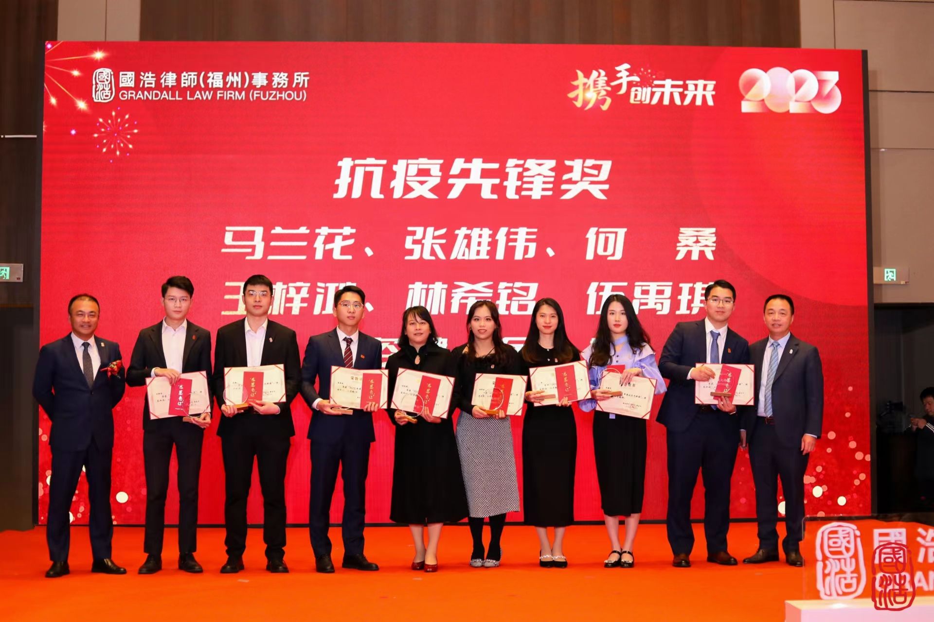 在年度表彰環節中,國浩福州分別為“年度團體貢獻獎”“2022律師論壇榮譽獎”“新銳員工獎”“工作積極分子”“最佳公益獎”無私奉獻獎”“抗疫先鋒獎”“年度黨員先鋒獎”“年度優秀律師”“最佳開拓獎”“業務精進獎”等獲獎集體和個人頒發了獎項,表彰過去一年為國浩福州作出突出貢獻的家人。