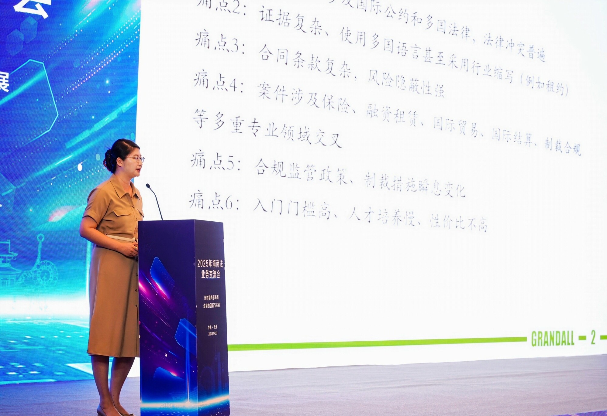 賈逸鷗律師結合多年實務經驗,深入剖析了當前海事海商法律服務面臨的六大核心痛點,并提出了運用人工智能技術的創新解決方案。她指出,當前海事海商法律服務面臨多國法律沖突與國際公約適用難題、多語言證據處理成本高昂、復雜合同風險識別困難、跨領域專業知識壁壘、政策快速變化帶來的合規壓力、人才培養性價比低六大行業痛點亟待突破。對此,她分享了其利用人工智能技術在法律文書智能生成與審查、多語言文件快速翻譯處理、外國法律高效檢索分析、案件策略智能輔助制定、合規風險動態監控、專業人才快速培養、行業趨勢智能預測七個常見場景下的應用實踐?!癆I技術不會取代專業律師,但能讓我們突破傳統局限,為客戶創造更大價值”,賈逸鷗律師特別分享了其團隊通過AI技術實現的“國內起草+海外律師修訂”創新服務模式,并指出該模式已在實際業務中實現為出??蛻麸@著增本增效。