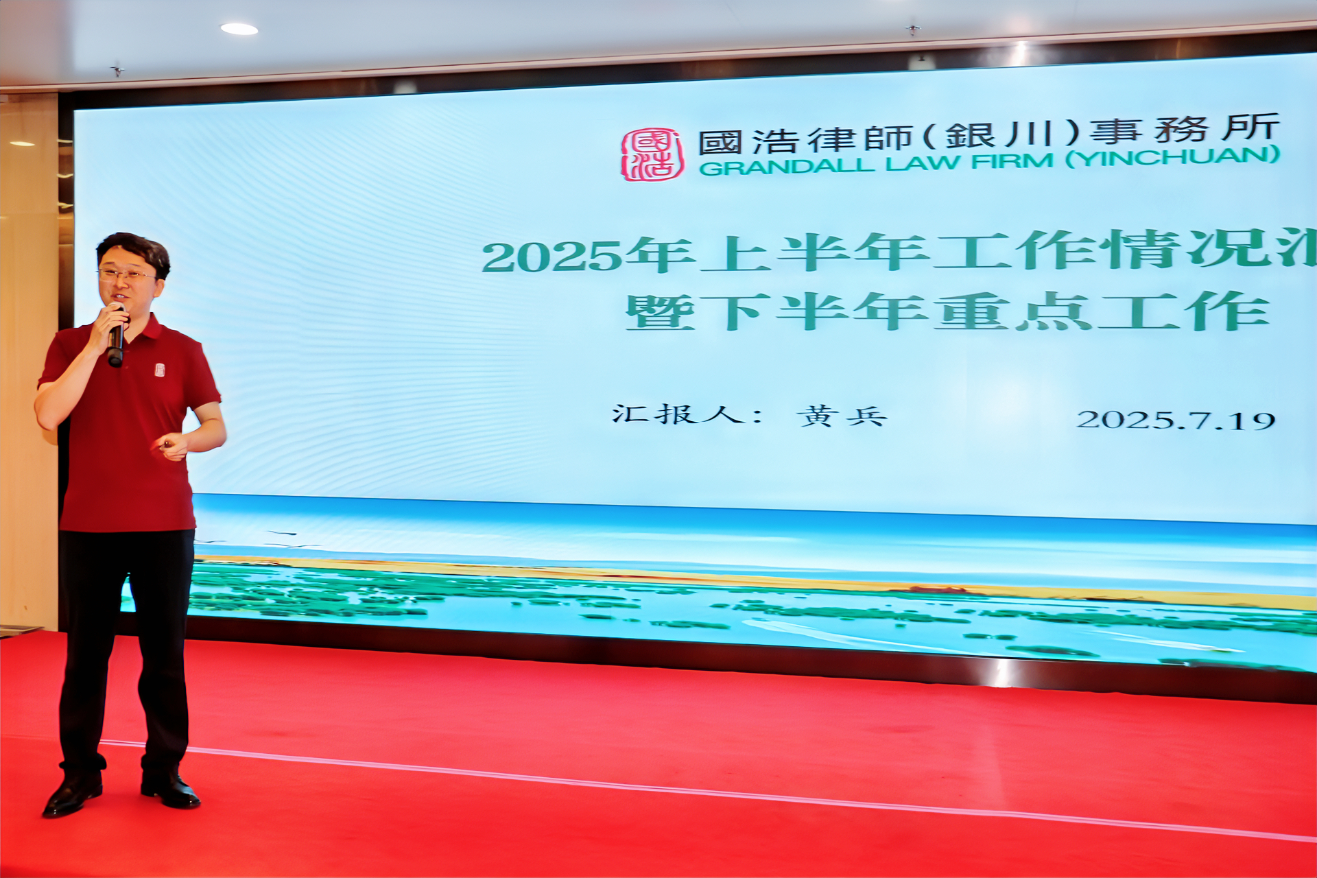 隨后,國浩銀川管理合伙人黃兵從律所人才建設、業務發展、制度建設、行政品宣、數智推廣、專業活動、幸福文化、內外培訓等方面對上半年的工作進行了全面回顧,并從律所整體運營、團隊建設成效、品牌影響力提升等多個維度,系統梳理了上半年的發展成果與亮點。此外,黃兵律師還在客觀分析了當前面臨的挑戰和機遇的基礎上,對下半年的工作提出明確方向和具體安排。他指出,國浩銀川將在今后繼續努力凝聚合伙人共同理念和價值觀,規范運用管理賦能,完善溝通機制,在專業服務深化、風控質量管理、律師人才培養、律所文化形成、制度完善修訂等領域實干篤行。
