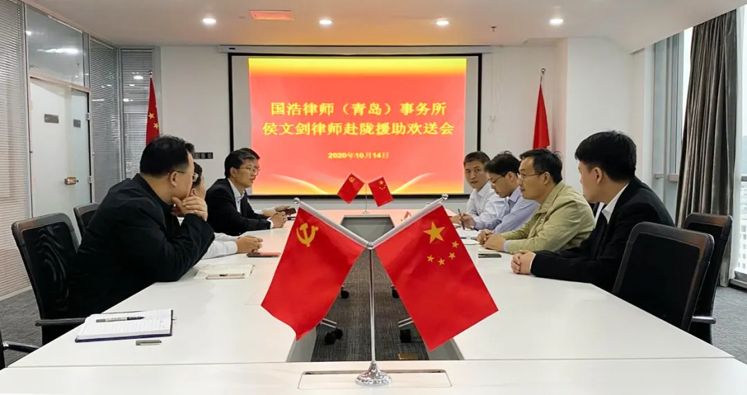 2020年10月14日,國浩青島辦公室為侯文劍律師舉行歡送會。青島市司法局“駐所實訓干部”法律顧問和法律事務處處長張前進應邀出席,國浩青島管理合伙人、主任張日輝,合伙人王朝賢、張國權、周鵬、肖穎、鞠波、彭山嶺等參加。歡送會由國浩青島合伙人、黨支部書記王振寶主持。