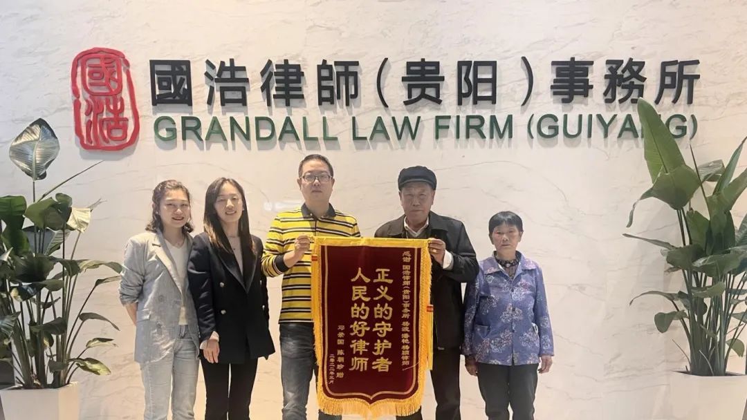 “正義的守護(hù)者、人民的好律師。”2022年4月25日下午,兩位老人提著一面錦旗來(lái)到國(guó)浩貴陽(yáng)辦公室,飽含深情地對(duì)國(guó)浩貴陽(yáng)合伙人楊波和律師潘艷、楊穎說(shuō):“我們老兩口特意過(guò)來(lái)送你們一面錦旗,這個(gè)一定要收下,感謝你們。”