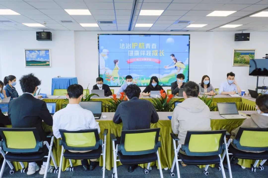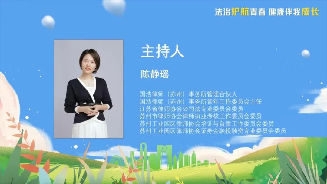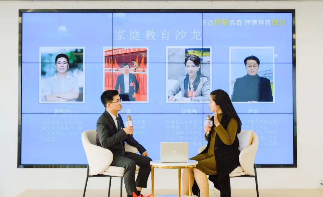 蘇州市青年聯合會常委、社工社團屆別秘書長、蘇州技師學院教研室主任王震,西安交通大學蘇州附屬中學黨委委員、第三支部書記、信息中心主任郭松柏,昆山經濟技術開發區高級中學校長、昆山市人大代表、昆山市高中家庭教育聯盟理事長尹華,民建昆山市委副主委、政協常委、昆山經濟技術開發區包橋小學校長、家庭教育指導師陸麗梅,國浩蘇州管理合伙人、主任、黨支部書記葛霞青,國浩蘇州合伙人、青工委主任陳靜瑤,國浩蘇州合伙人鄔鈺蓮,律師柳一舟,以及線上青聯委員、律界同仁、家長代表、學生代表約百人參會,國浩蘇州青工委組織二十余名國浩蘇州青年律師線下同步參會,陳靜瑤律師擔任主持人。